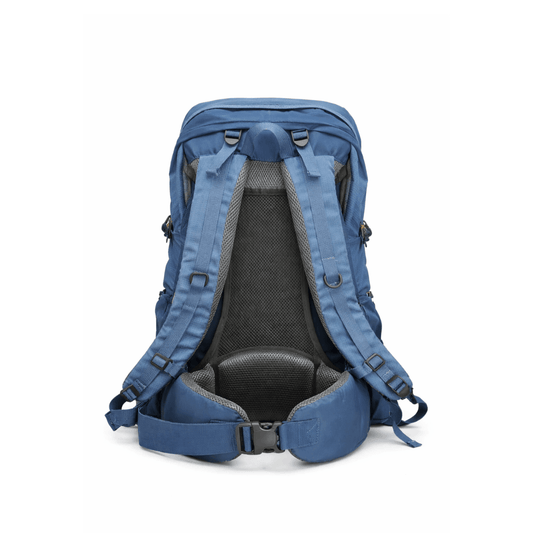 Plavi planinarski ruksak s pojasnim remenom i mrežastim leđima