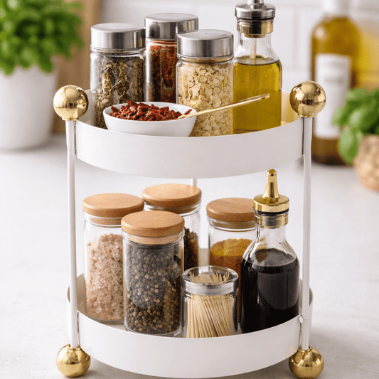 Mali metalni dvoslojni okrugli organizator 18x25 cm – bež sa zlatnim detaljima