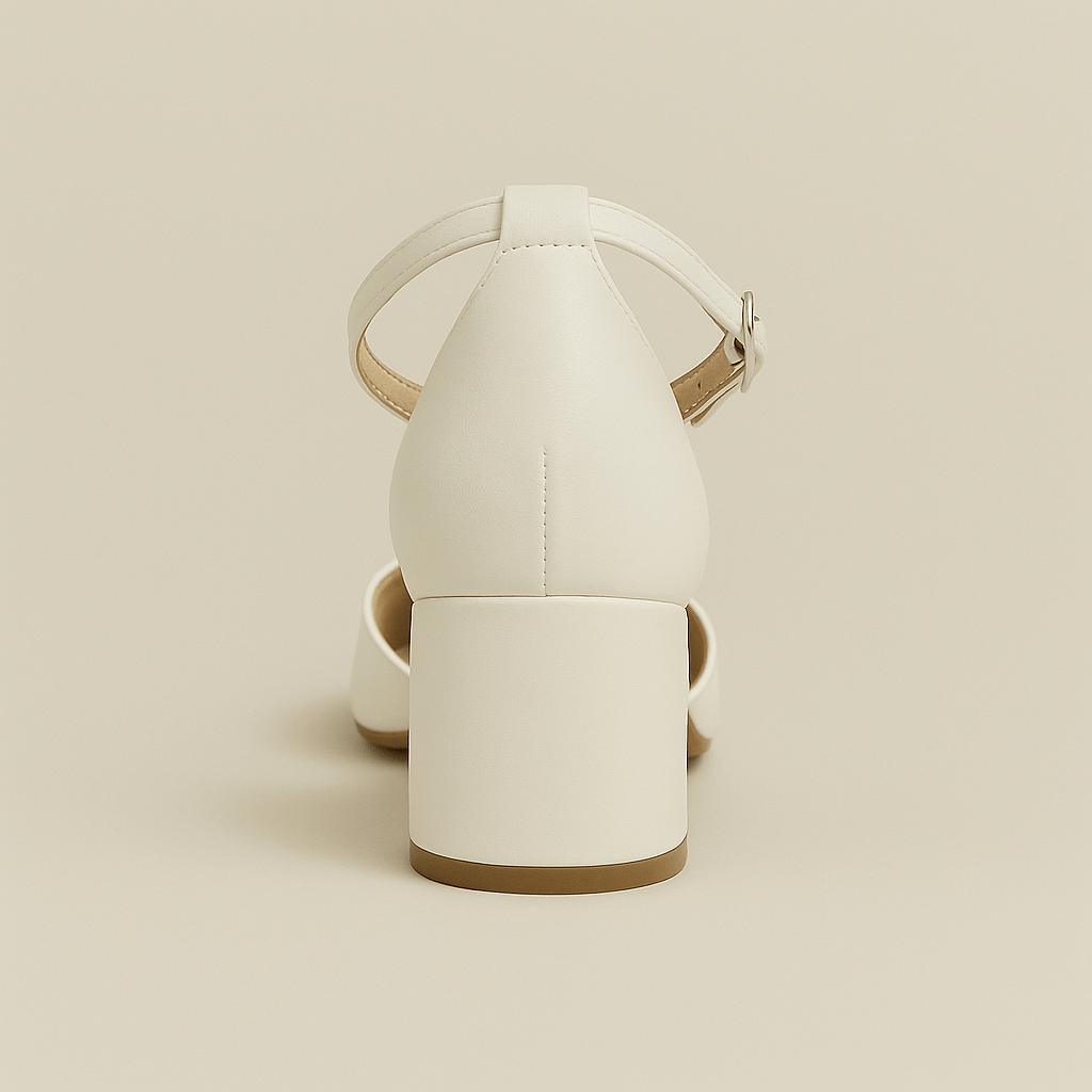 Elegantne bijele cipele s niskom blok petom i zatvorenim prednjim dijelom. Podesivi remen oko gležnja osigurava stabilnost, dok zaobljeni vrh pruža udobnost pri hodu.