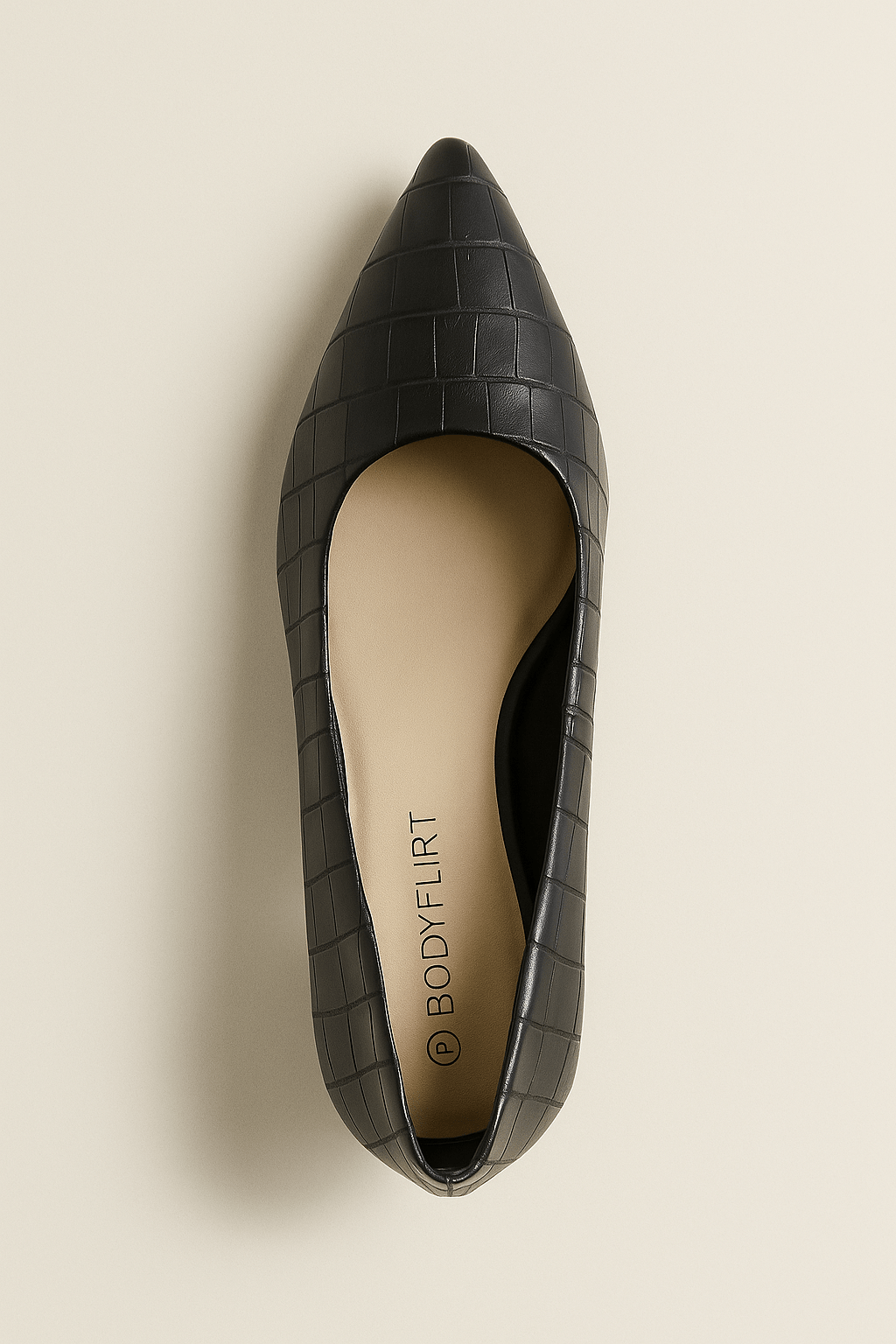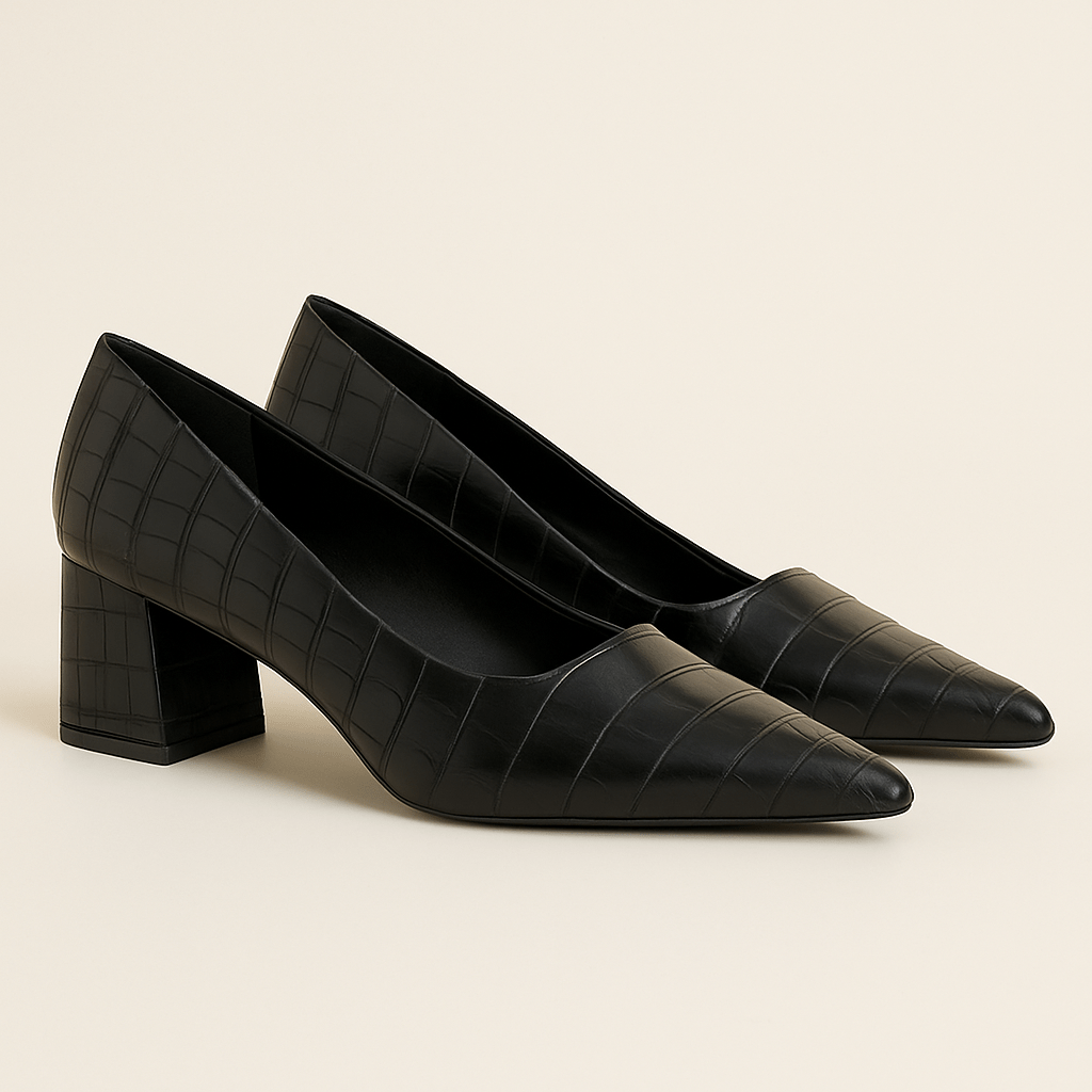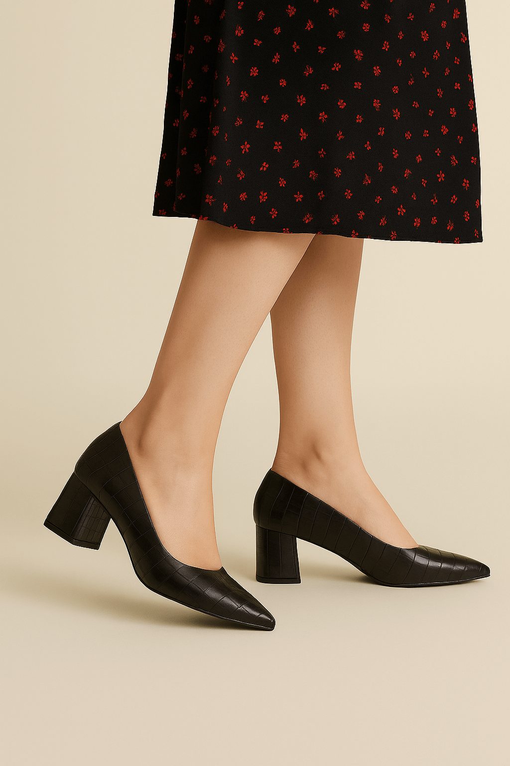 Elegantne ženske cipele s blok petom i teksturom nalik krokodilskoj koži. Udobna peta srednje visine pruža stabilnost. Špicasti vrh naglašava sofisticiran izgled. Dostupne u klasičnoj crnoj boji.