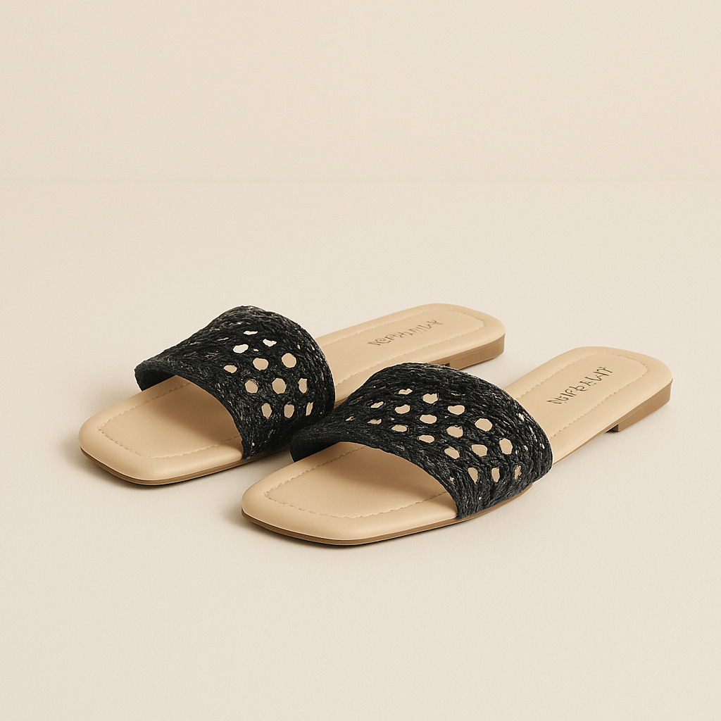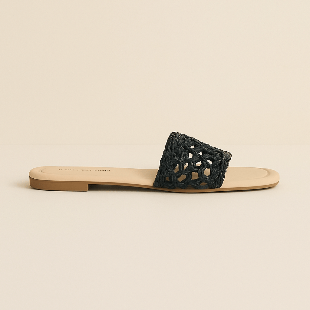 Ženske sandale s ravnim đonom i kvadratnim vrhom. Gornji dio izrađen od crnog pletenog materijala. Uložak bež boje s natpisom BODYFLIRT.