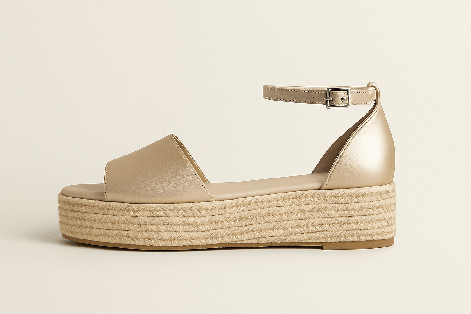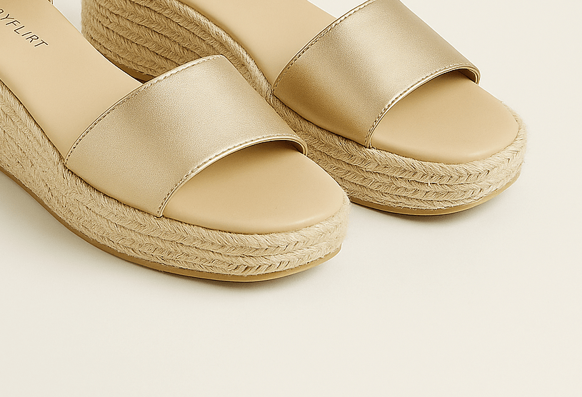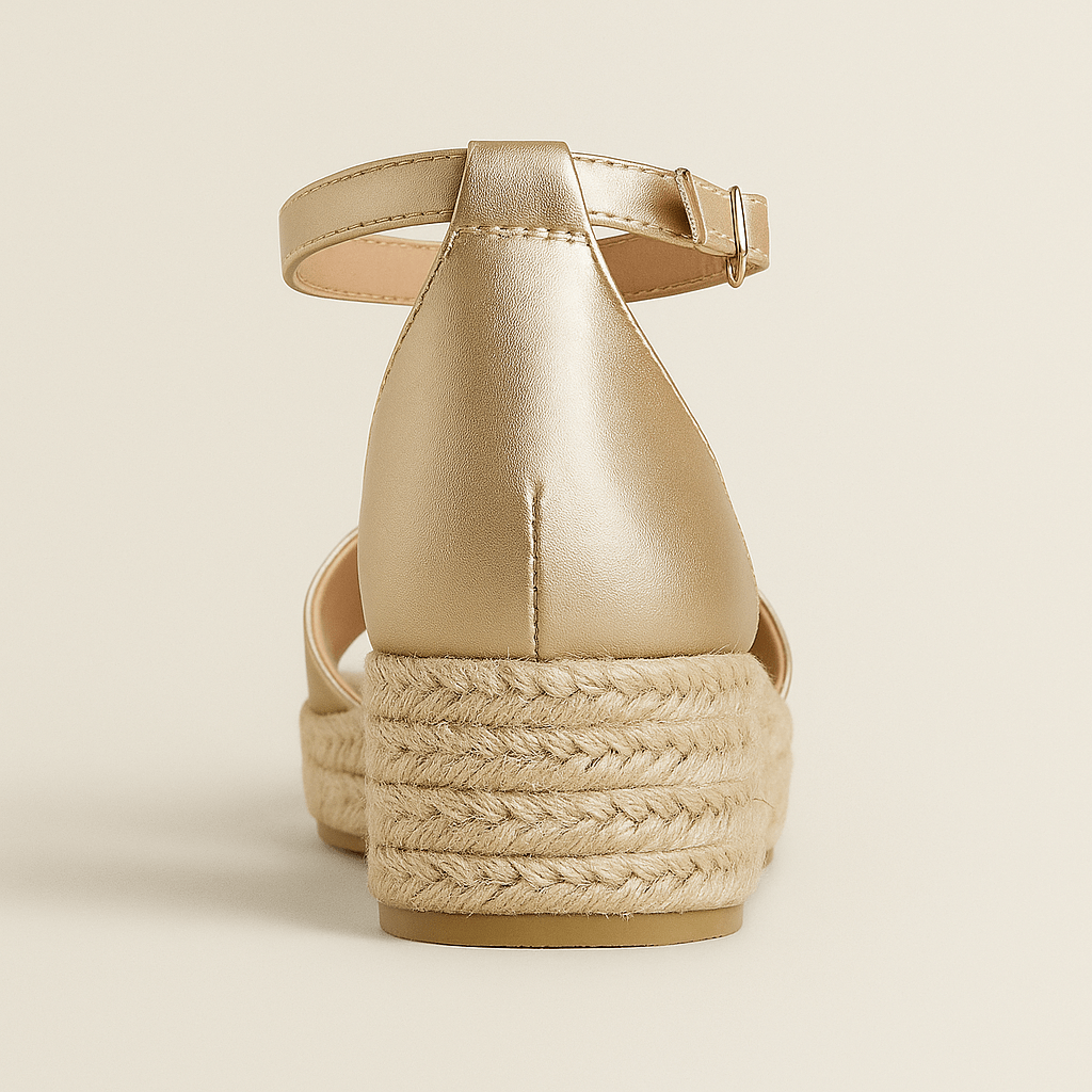 Ženske sandale u zlatnoj nijansi s udobnom platformom i pletenim detaljem na đonu. Model ima zatvorenu petu i podesivi remen oko zgloba za stabilnost pri hodu. Idealne za svakodnevno nošenje ili večernje kombinacije.