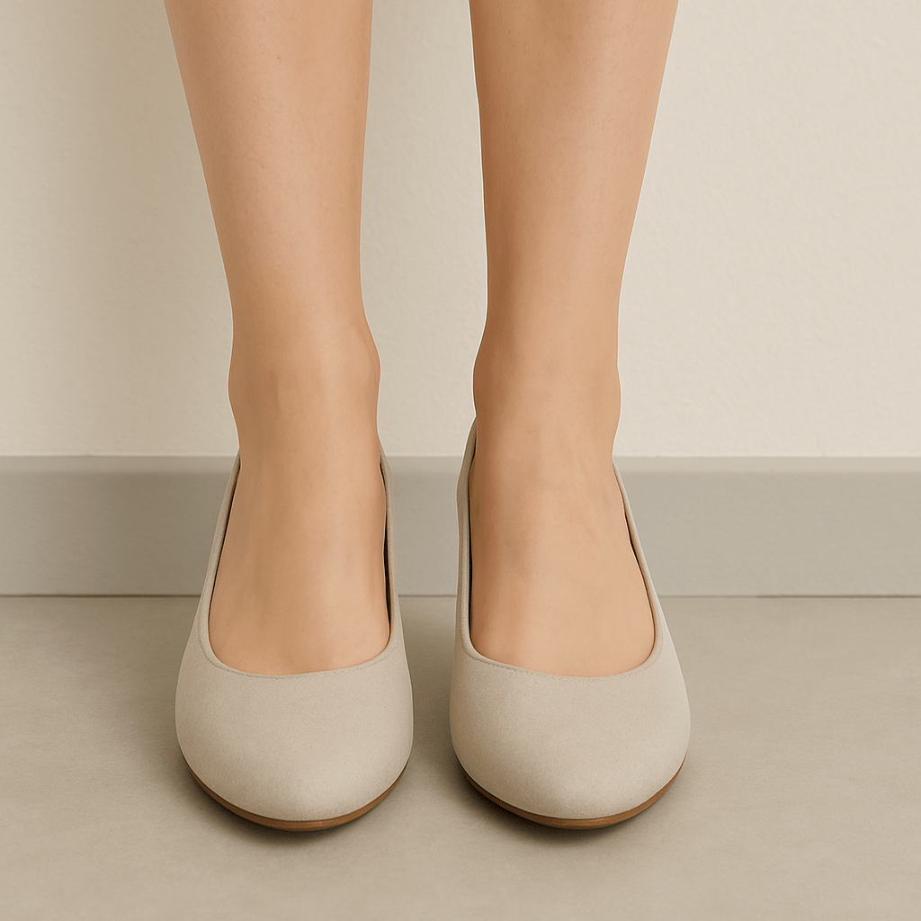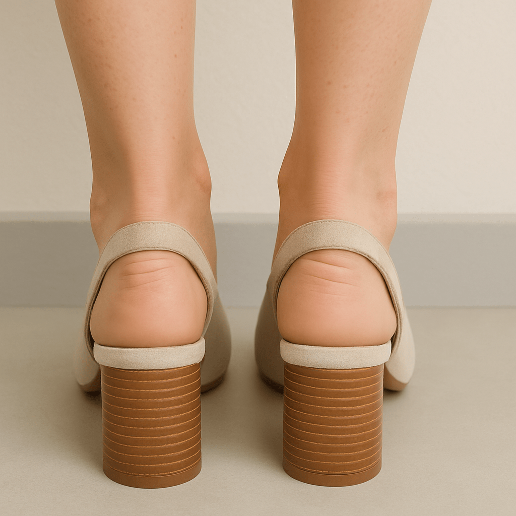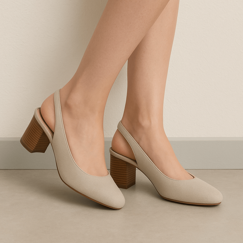 Ženske cipele u bež boji, s udobnim kožnim uloškom i stabilnom blok petom u drvenom tonu. Remen s elastičnim dijelom pruža dodatnu sigurnost i prilagodljivost.