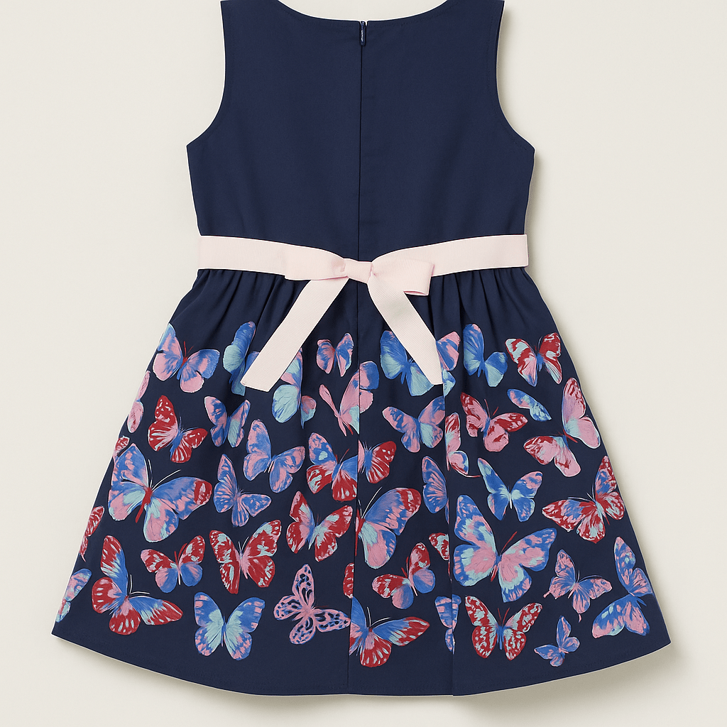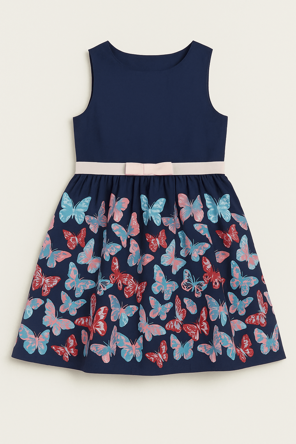 Lagana dječija haljina bez rukava u tamnoplavoj boji, ukrašena šarenim printom leptira i svijetloružičastom mašnom u struku. Haljina ima patentni zatvarač na leđima za lako oblačenje i idealna je za toplije dane ili svečane prilike.