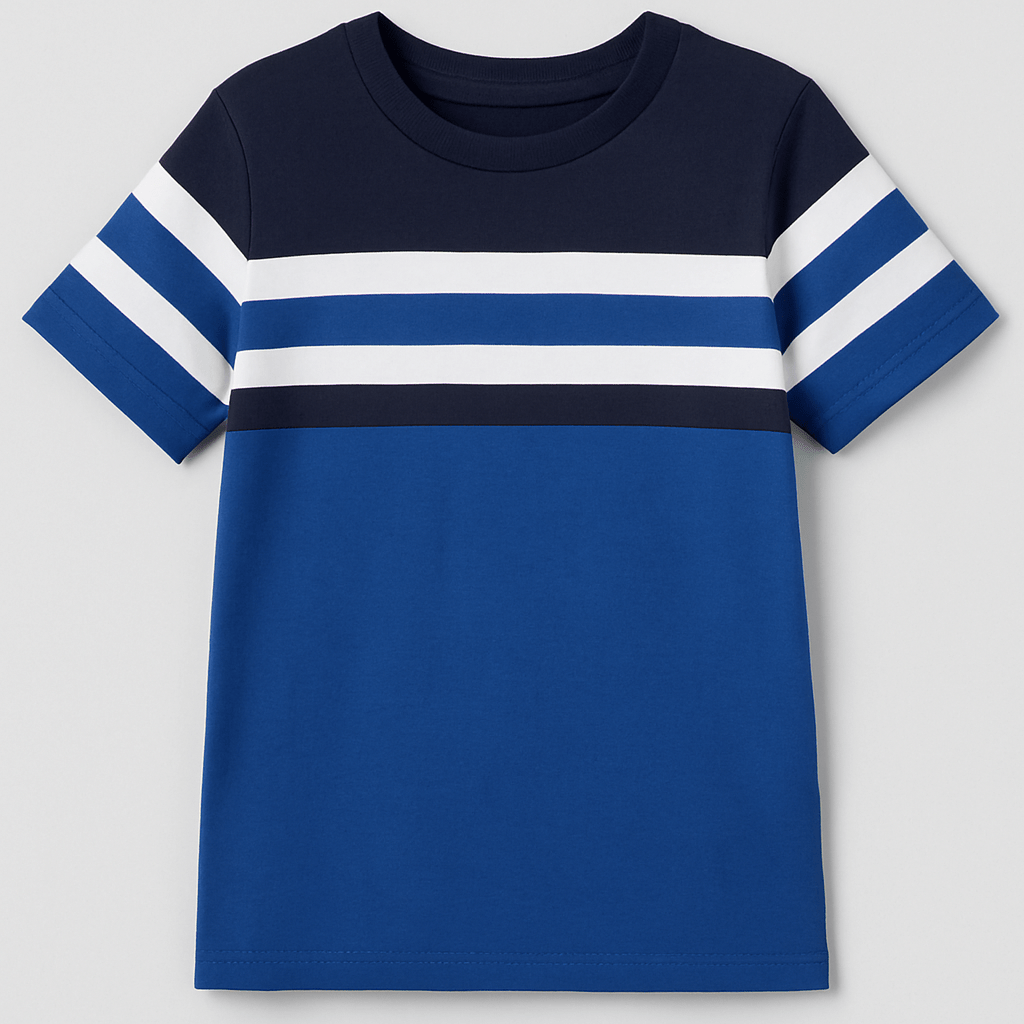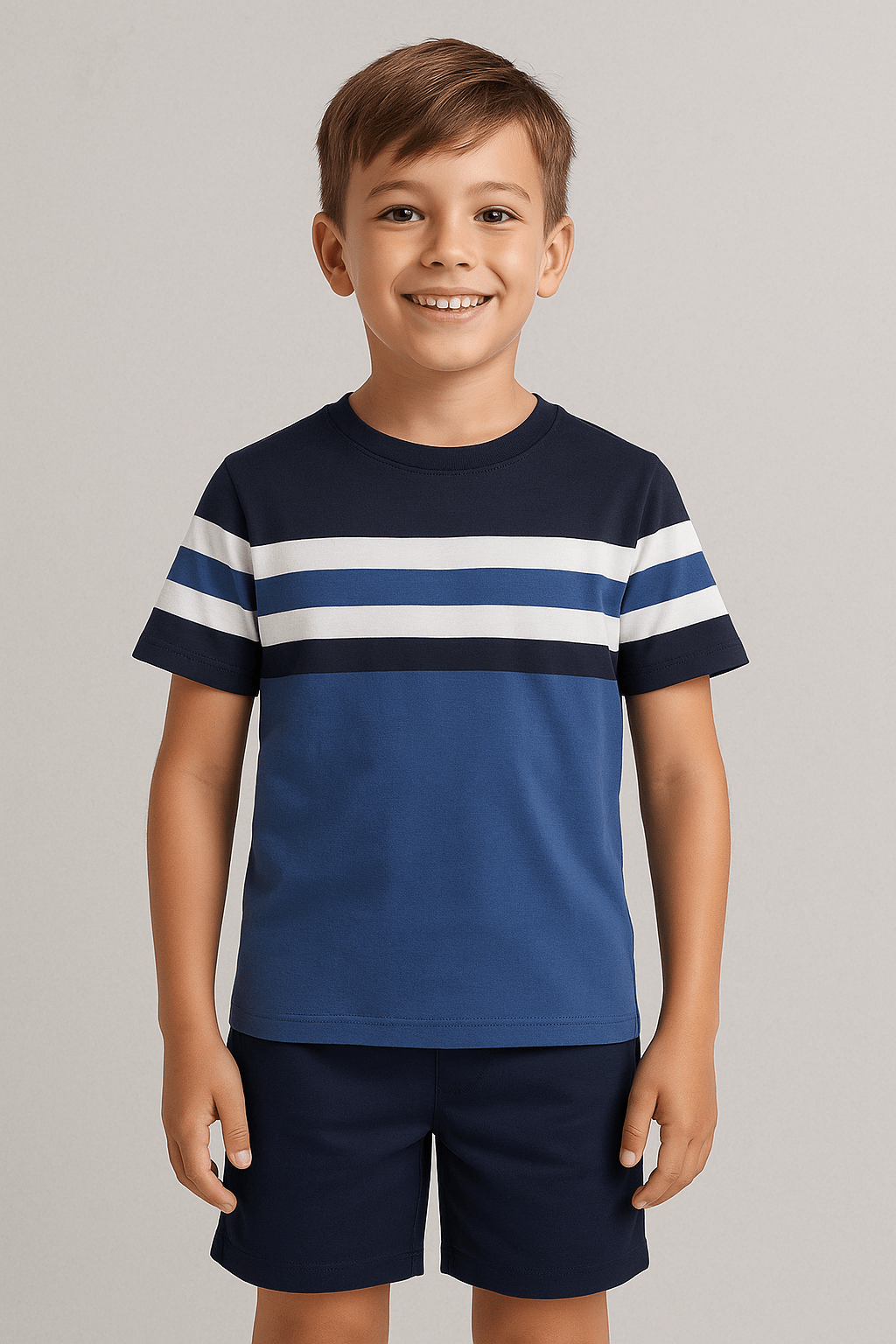 Udobna i moderna dječija majica kratkih rukava s atraktivnim horizontalnim prugama u tamnoplavoj, bijeloj, svijetloplavoj i kraljevsko plavoj boji. Izrađena od mekanog i prozračnog pamuka, idealna za svakodnevne aktivnosti, školu ili igru. Klasični okrugli izrez i ravni kroj osiguravaju udobno pristajanje i lako kombiniranje s trapericama, šorcevima ili trenirkama.