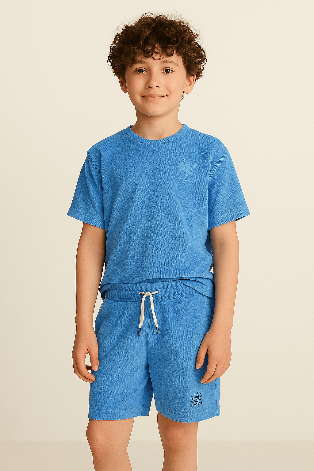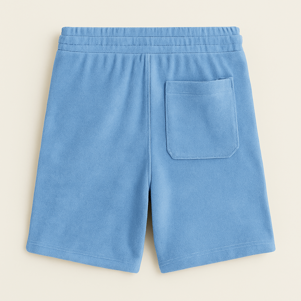 Plave frotir bermude izrađena od mekanog i upijajućeg materijala, idealna za ljeto i boravak na plaži. Kroj je ravan i komotan. Praktična i udobna opcija za svakodnevne aktivnosti ili nošenje nakon kupanja.