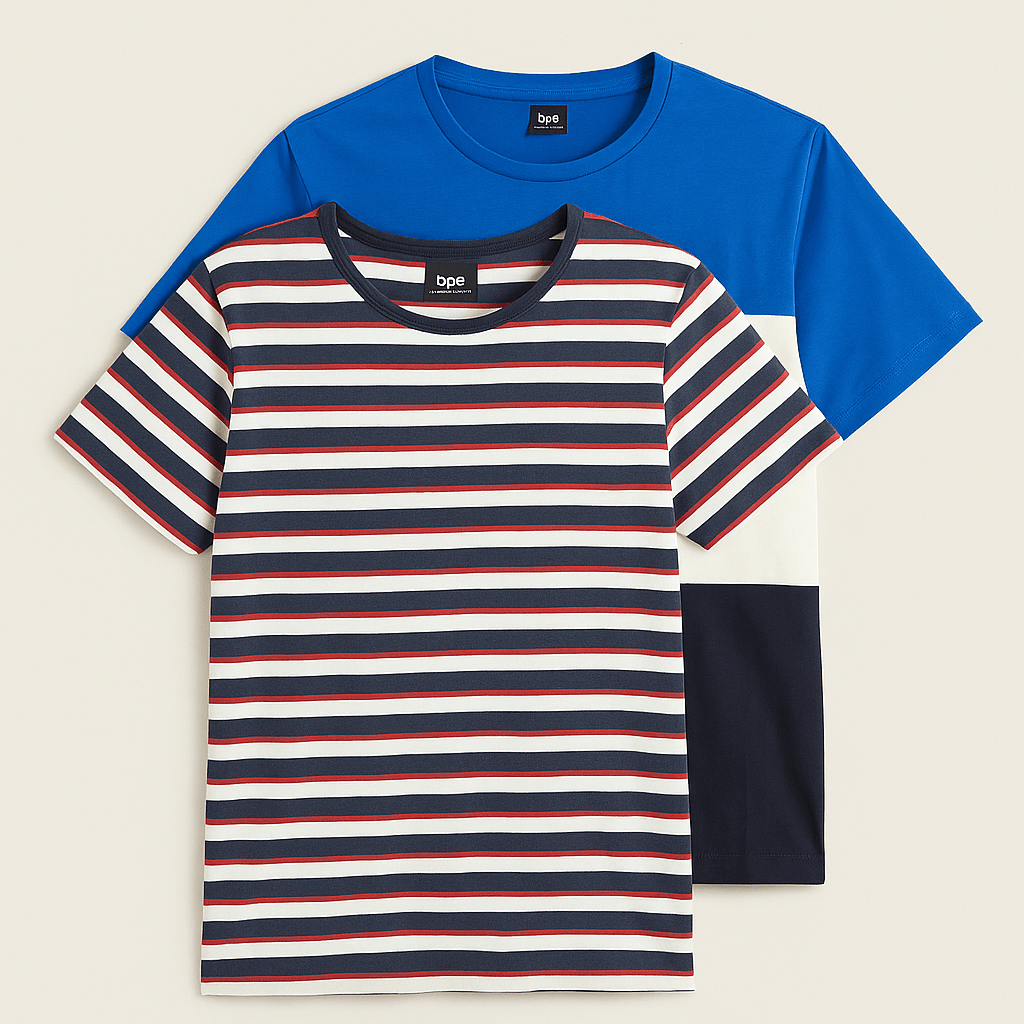 Dvodijelni set muških majica kratkih rukava. U setu dolazi jednobojna majica u mornarsko plavoj boji te druga s prugastim uzorkom u crvenoj, bijeloj i tamnoplavoj kombinaciji. Obje majice su izrađene od 100% pamuka, ugodne za nošenje i jednostavne za kombiniranje uz svakodnevni stil. Idealne za ljeto ili slojevito odijevanje.