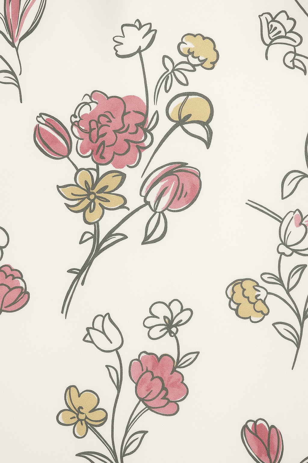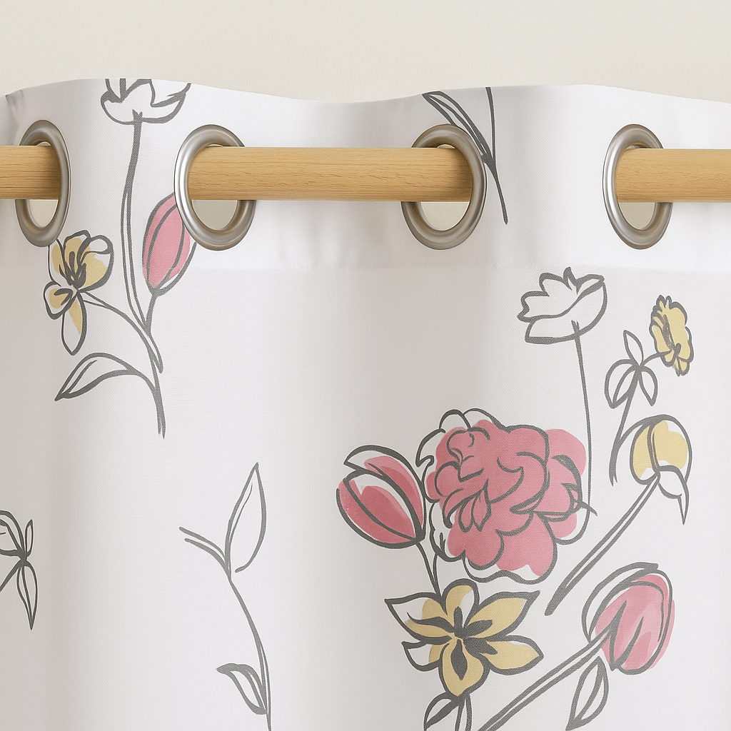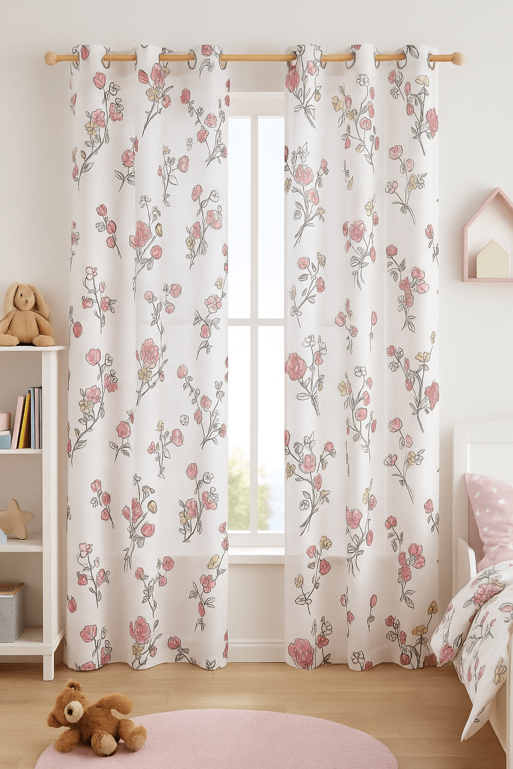 S uzorkom cvijeća izrađena od 100% poliestera. Materijal propušta prirodno svjetlo i zadržava privatnost u prostoru. Uzorak uključuje više boja i prikazuje stilizirane cvjetove. Zavjesa s uzorkom ružičasti ruža i grančica.