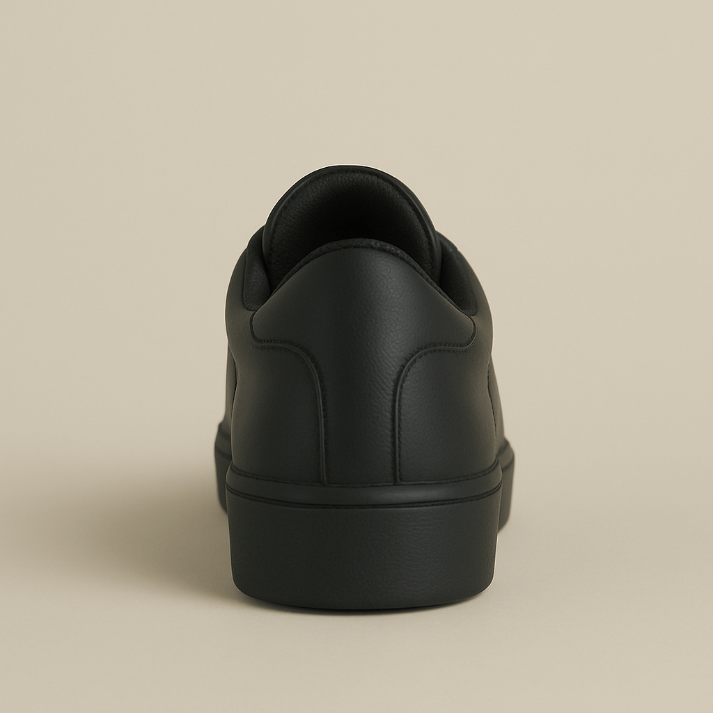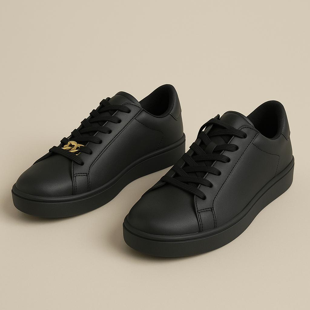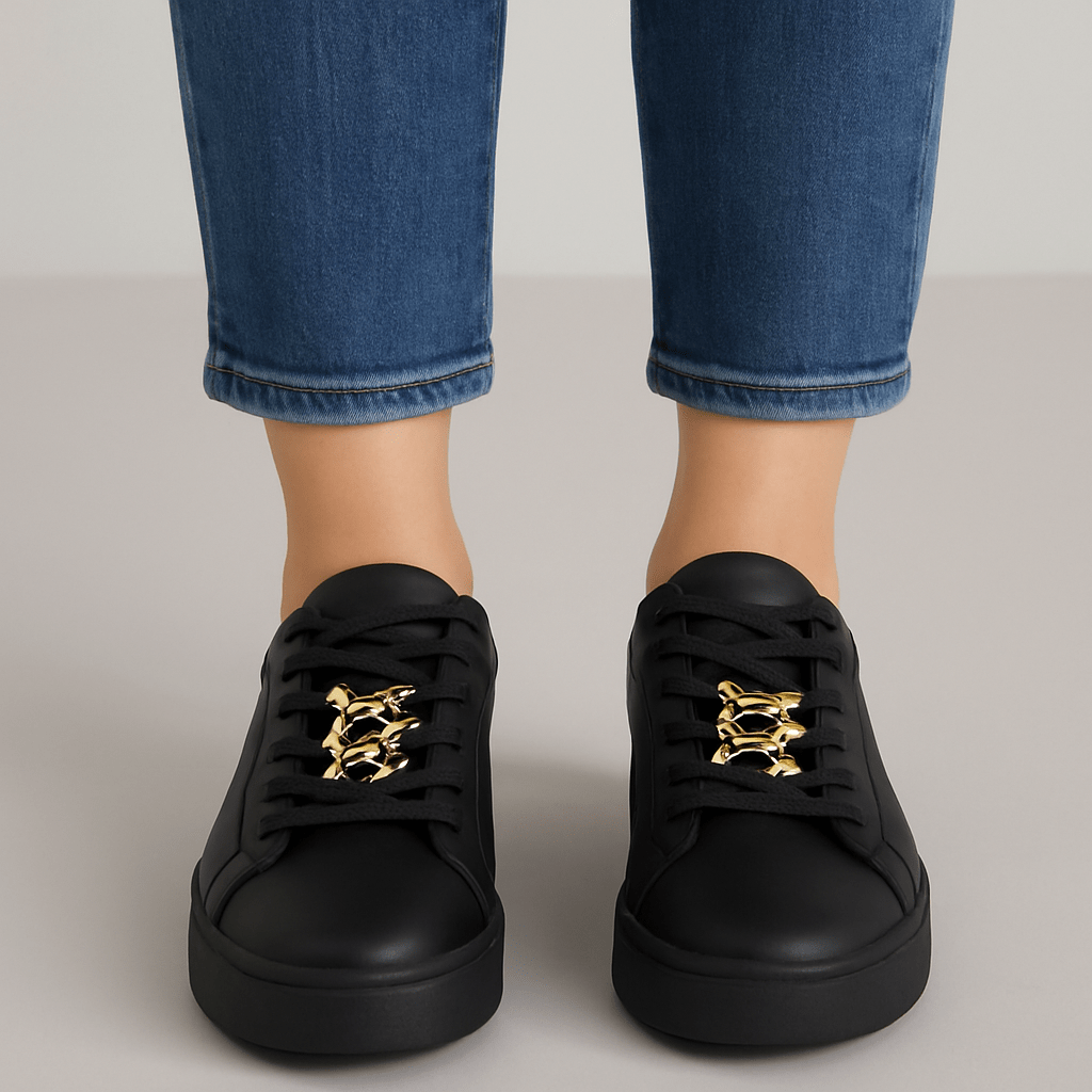 Niske crne tenisice s glatkom površinom i zlatnim lancem umjesto klasičnih pertli. Moderan dizajn koji kombinira udobnost i stil. Idealne za svakodnevno nošenje, uz traperice, haljine ili casual odjevne kombinacije. Gumeni potplat pruža dodatnu stabilnost i udobnost pri hodu.
