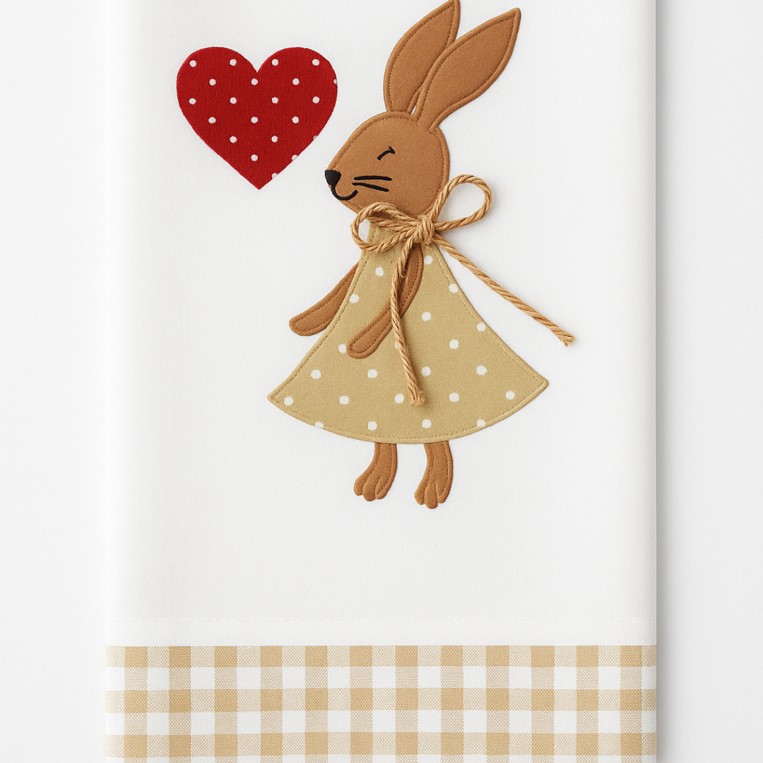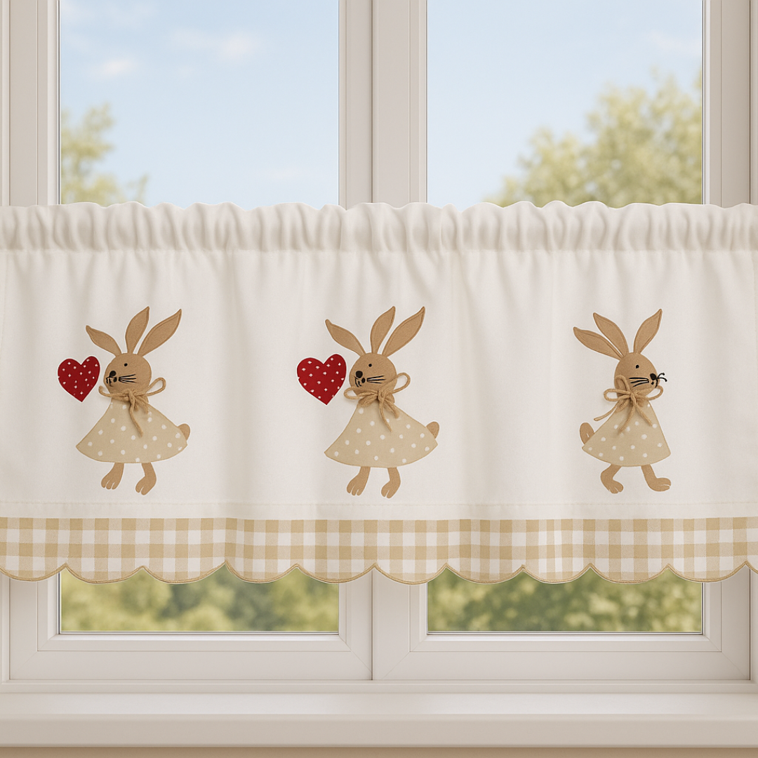 Unesite toplinu i šarm u svoj dom uz dekorativnu zavjesu s motivom zeca i srca. Zavjesa je dimenzija 125x30 cm, izrađena od 100% pamuka, organskog pamuka te ukrašena bež kariranim rubom s donje strane i aplikacijom zečića i srca.