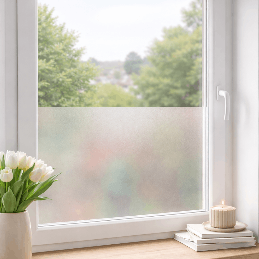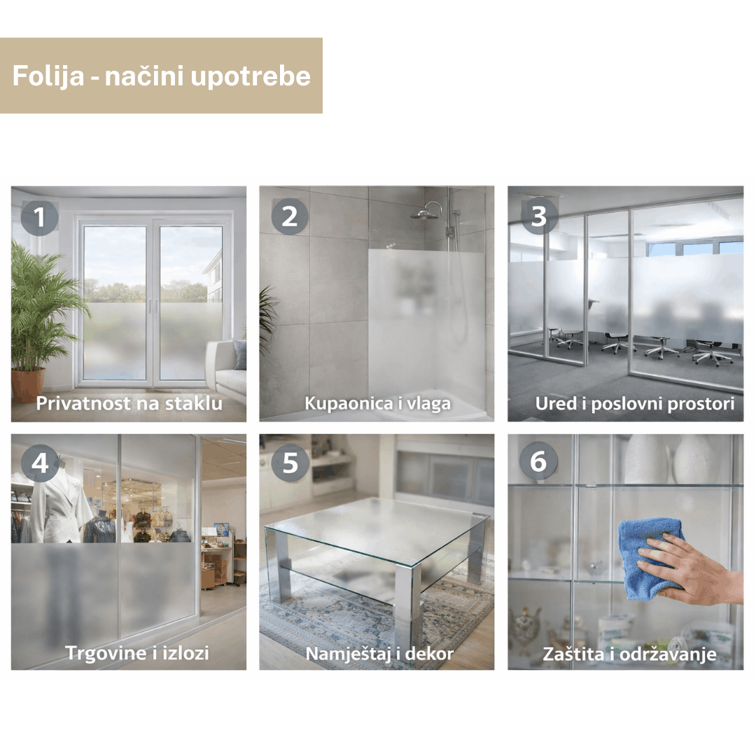 Samoljepljiva folija za staklo dimenzija 3 m × 45 cm. Koristi se za prekrivanje staklenih površina radi privatnosti i smanjenja pogleda kroz staklo. Postavlja se lijepljenjem na čistu i glatku staklenu površinu.
