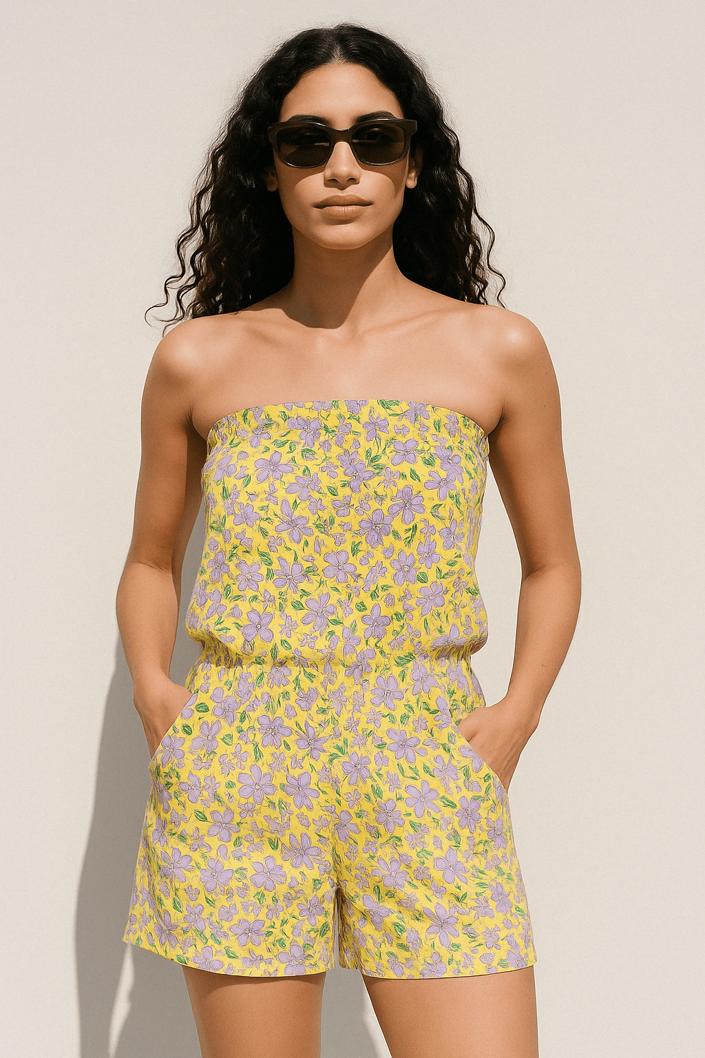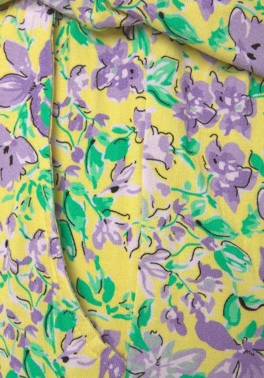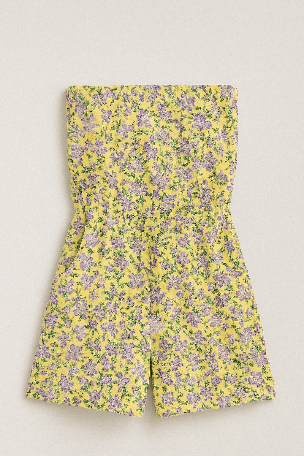 Kombinezon bez naramenica rastezljiv u struku. Ima dva bočna džepa. Tkanina je svijetložute boje s šarenim cvjetnim printom i zelenim listovima. Kroj je opušten i prilagođen za ljetne temperature.
