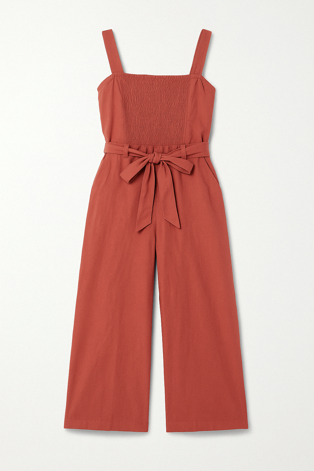 Kombinezon s ravnim prednjim izrezom, širokim nogavicama i pojasom koji se veže u struku. Naramenice su ravne širine, stražnji gornji dio ima prošiveni elastični panel. Materijal je gladak, bez uzorka.