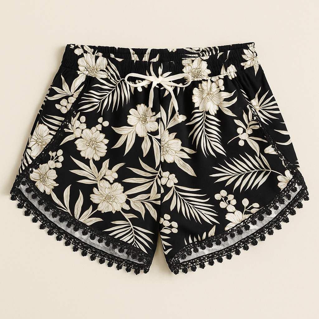 Crne hlače s elastičnim pojasom i bež cvjetnim printom. Ukrašene su crnom čipkom duž rubova. Pogodne za toplije dane.