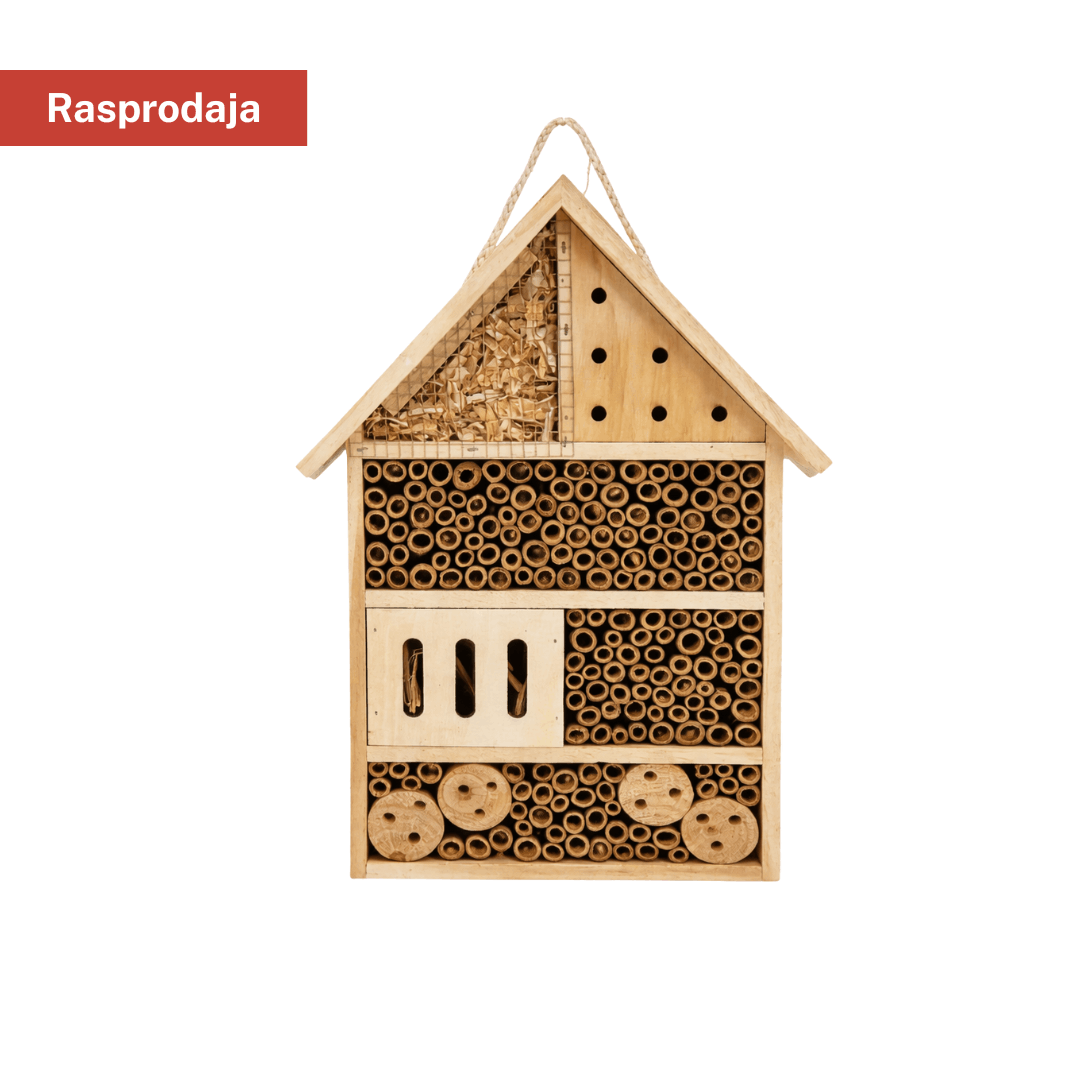Drvena kućica za insekte (hotel za korisne kukce) pruža sigurno sklonište za pčele samotarke i druge korisne insekte u vrtu ili na balkonu. Unutrašnjost je podijeljena u više odjeljaka s prirodnim punjenjem (npr. bambus cjevčice i drveni elementi) koji služe kao mjesto za gniježđenje. Kućica ima uže za jednostavno vješanje na drvo, ogradu ili zid i pomaže u očuvanju oprašivača u okolini.