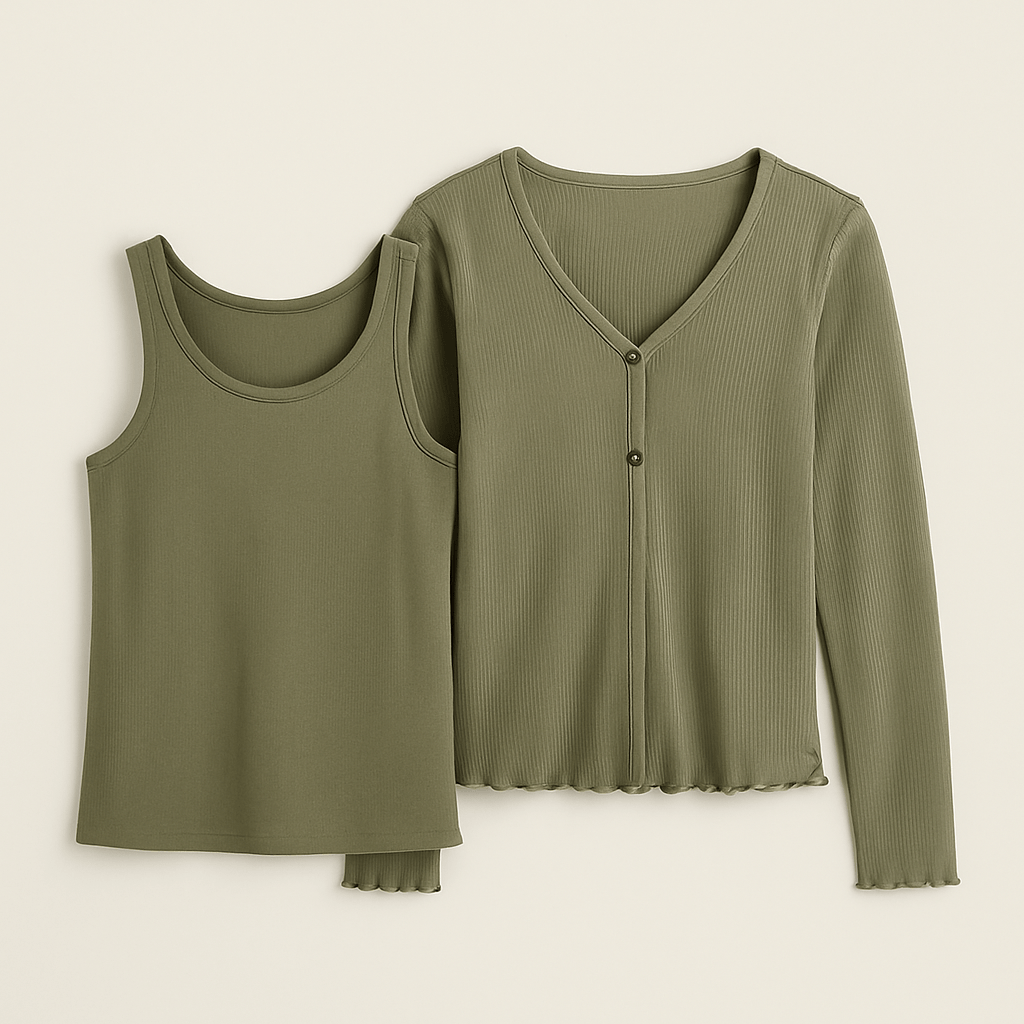 Dvodjelni set u rebrastog materijala, koji uključuje majicu bez rukava i dugi kardigan sa dva dugmeta. Opuštenog je kroja i savršen za svakodnevno slojevito oblačenje. Maslinasto zelena boja daje prirodan i nenametljiv izgled.