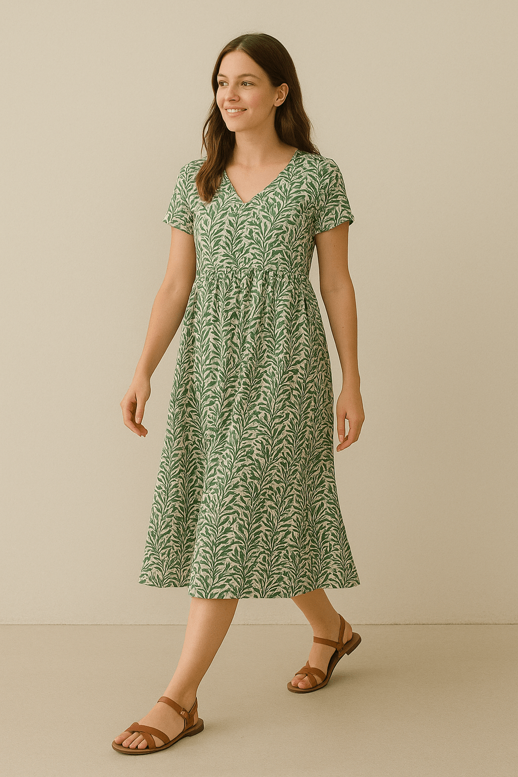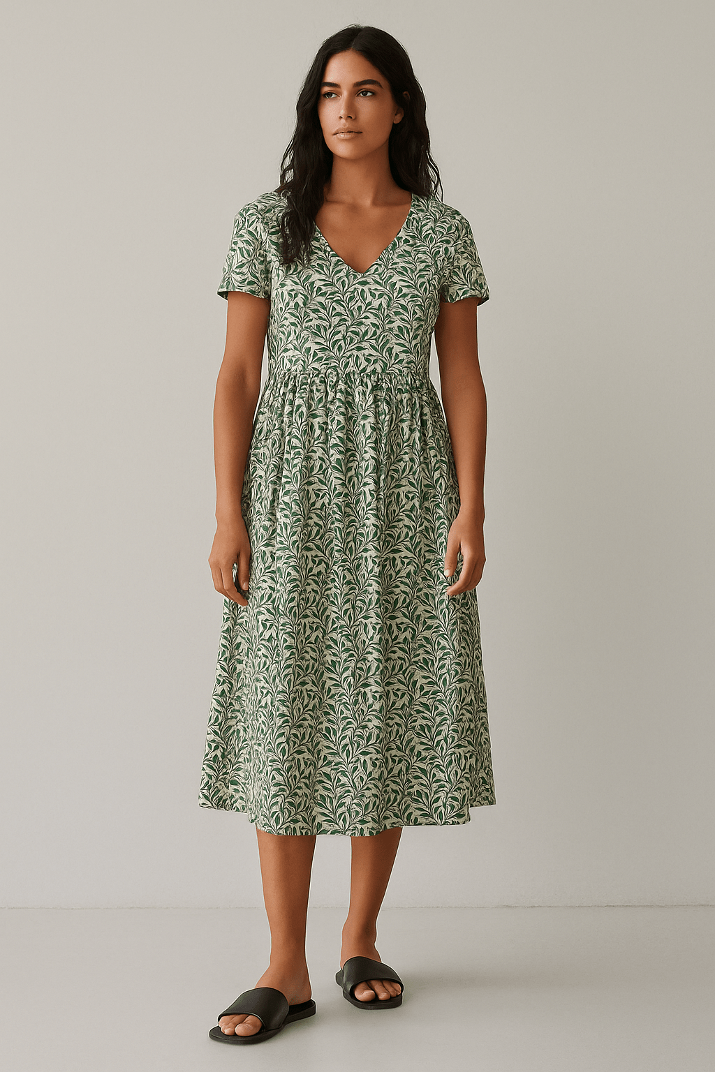 Ženstvena midi haljina s nježnim cvjetnim uzorkom. Lagani, prozračni materijal pruža udobnost tokom cijelog dana. A-kroj pristaje većini figura, sa nabranim i rastezljivim strukom. Dužina ispod koljena.
