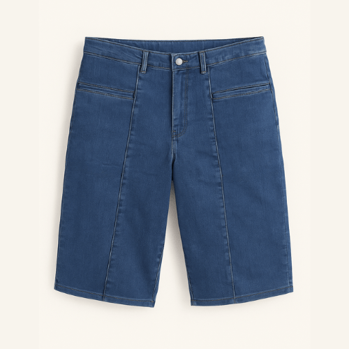 Unisex bermude od laganog jeansa s elastičnim pojasom, imaju dva prednja džepa sa strane i dva stražnja klasična džepa. Zakopčavanje na dugme. Krojene ravno, dužine do iznad koljena.