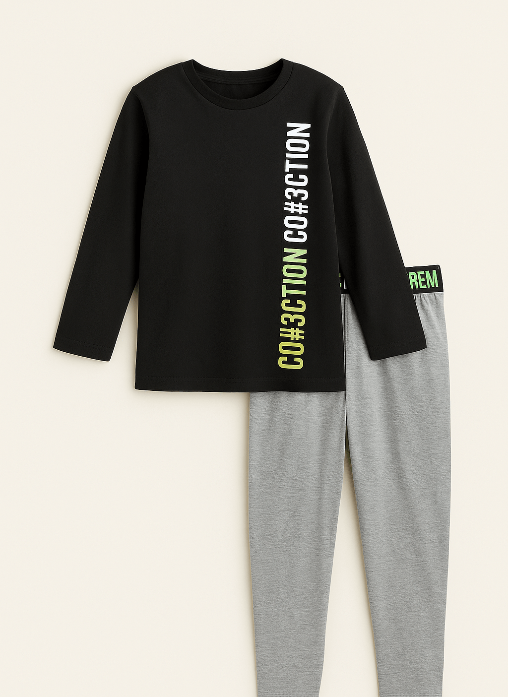 Dvodjelna dječja pidžama izrađena od 100% pamuka. Gornji dio je crne boje s upečatljivim printom, hlače sive boje s elastičnim pojasom u istom stilu i rastezljivim nogavicama.
