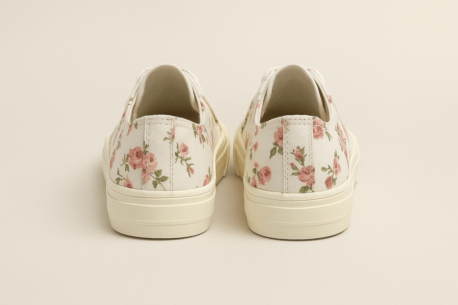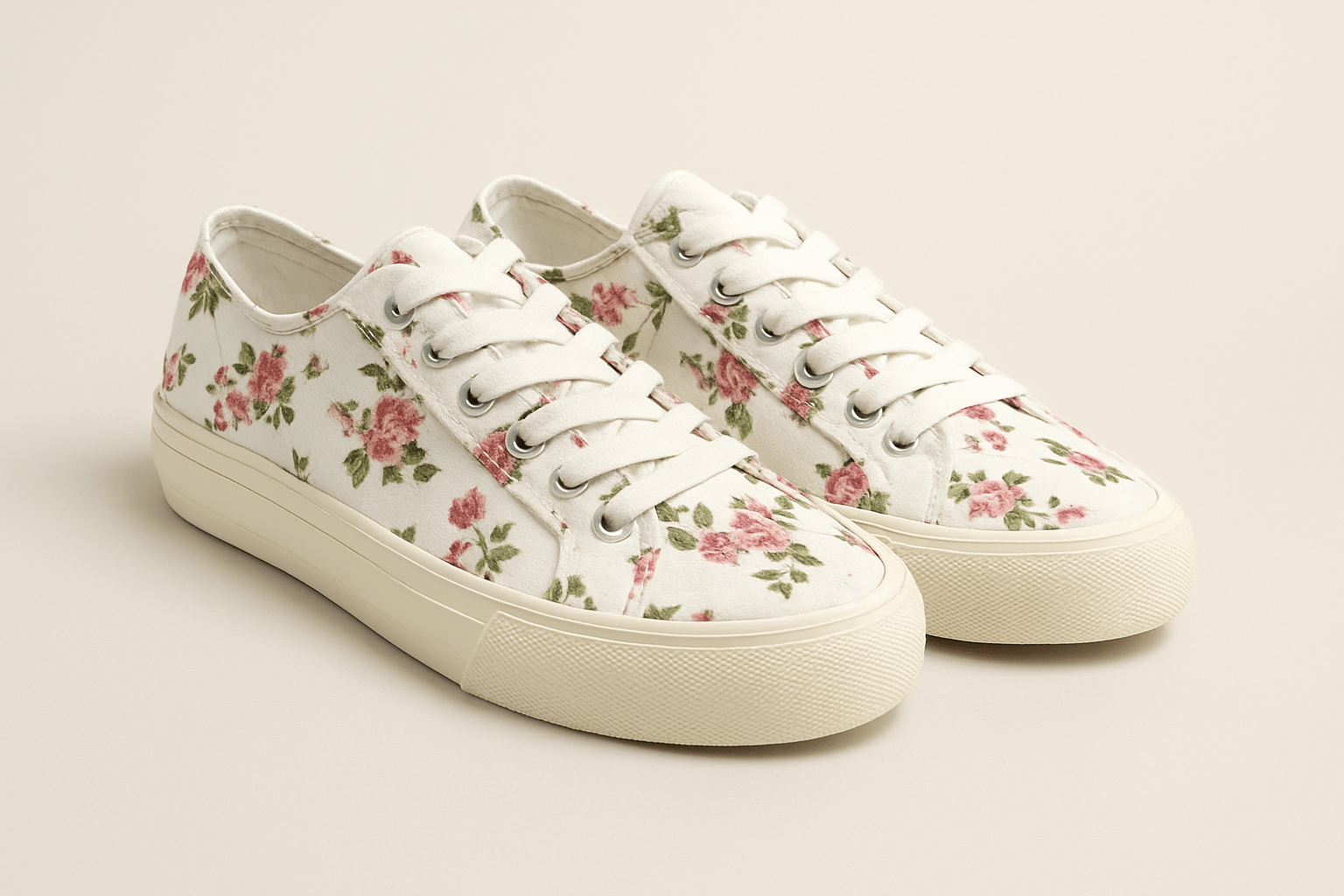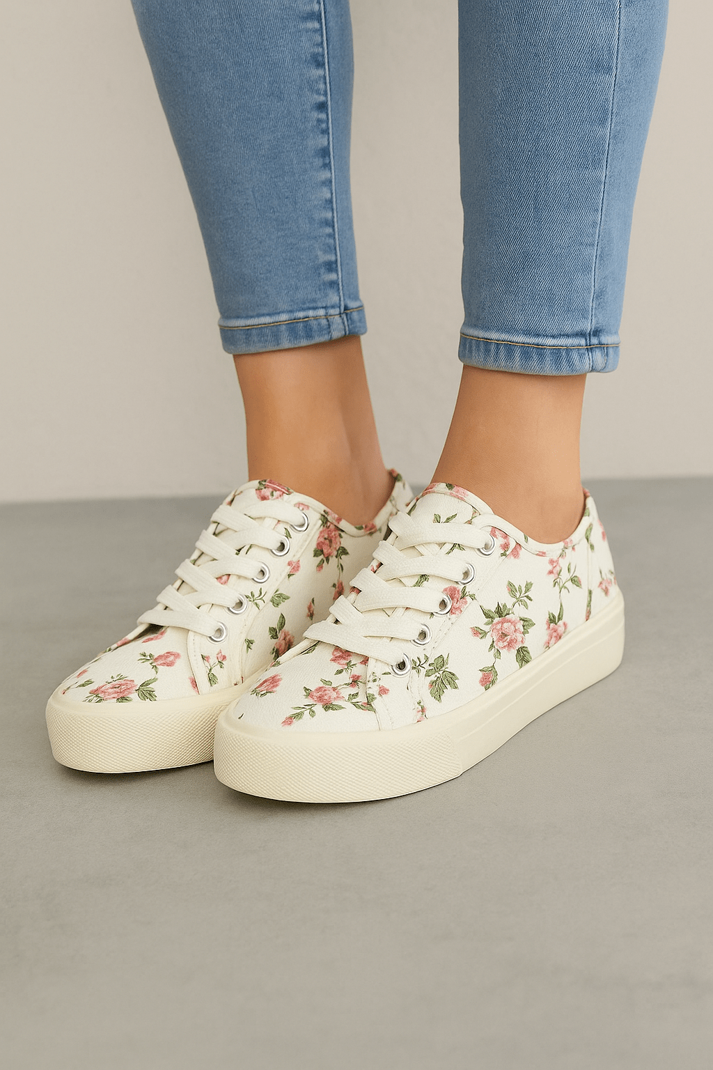 Lagane ženske platnene tenisice s nježnim uzorkom ružičastih ruža. Izrađene od udobnog tekstila s bijelim vezicama i čvrstim gumiranim đonom u bež nijansi.
