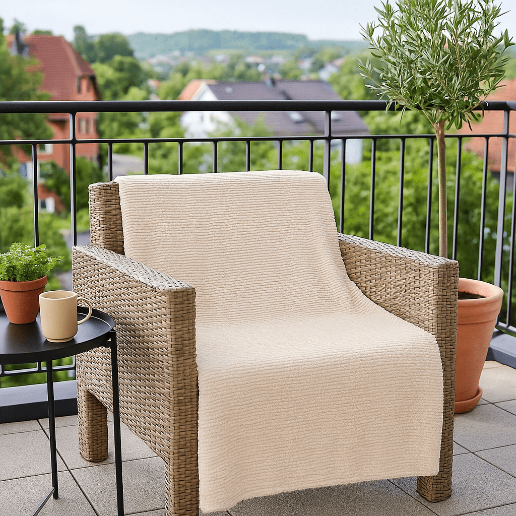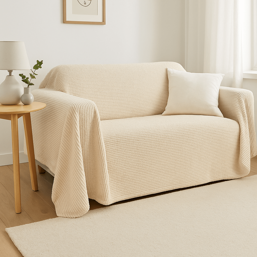 Pokrivač od mekog materijala s reljefnom teksturom, dimenzija cca. 160 x 140 cm. Sastav: 90% poliester, 10% poliamid. Praktičan za zaštitu sjedeće garniture ili dekoraciju. Prikladan za svakodnevnu upotrebu, lagan za održavanje – periv u perilici rublja na 30°C.