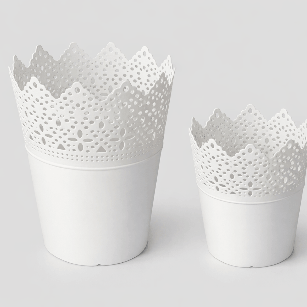 Mala bijela saksija/ukrasna posuda dimenzija 12 × 9cm sa dekorativnim perforiranim (čipkastim) rubom. Može se koristiti kao posuda za cvijet (uz umetnutu plastičnu posudu ili zaštitu) ili kao ukrasna posuda za odlaganje sitnica.