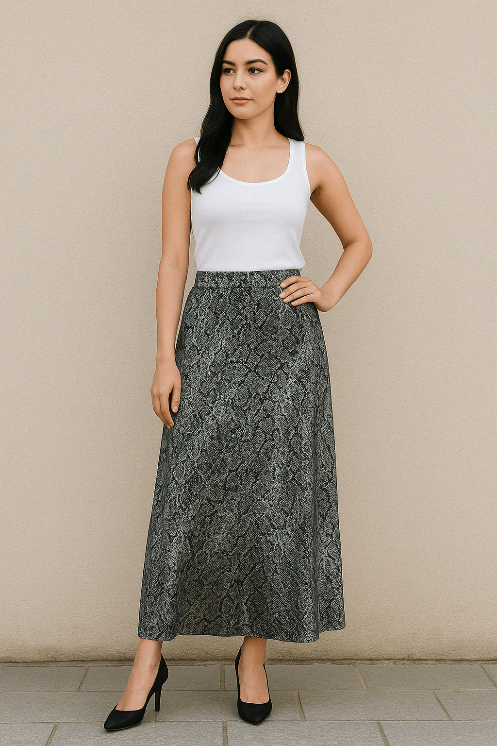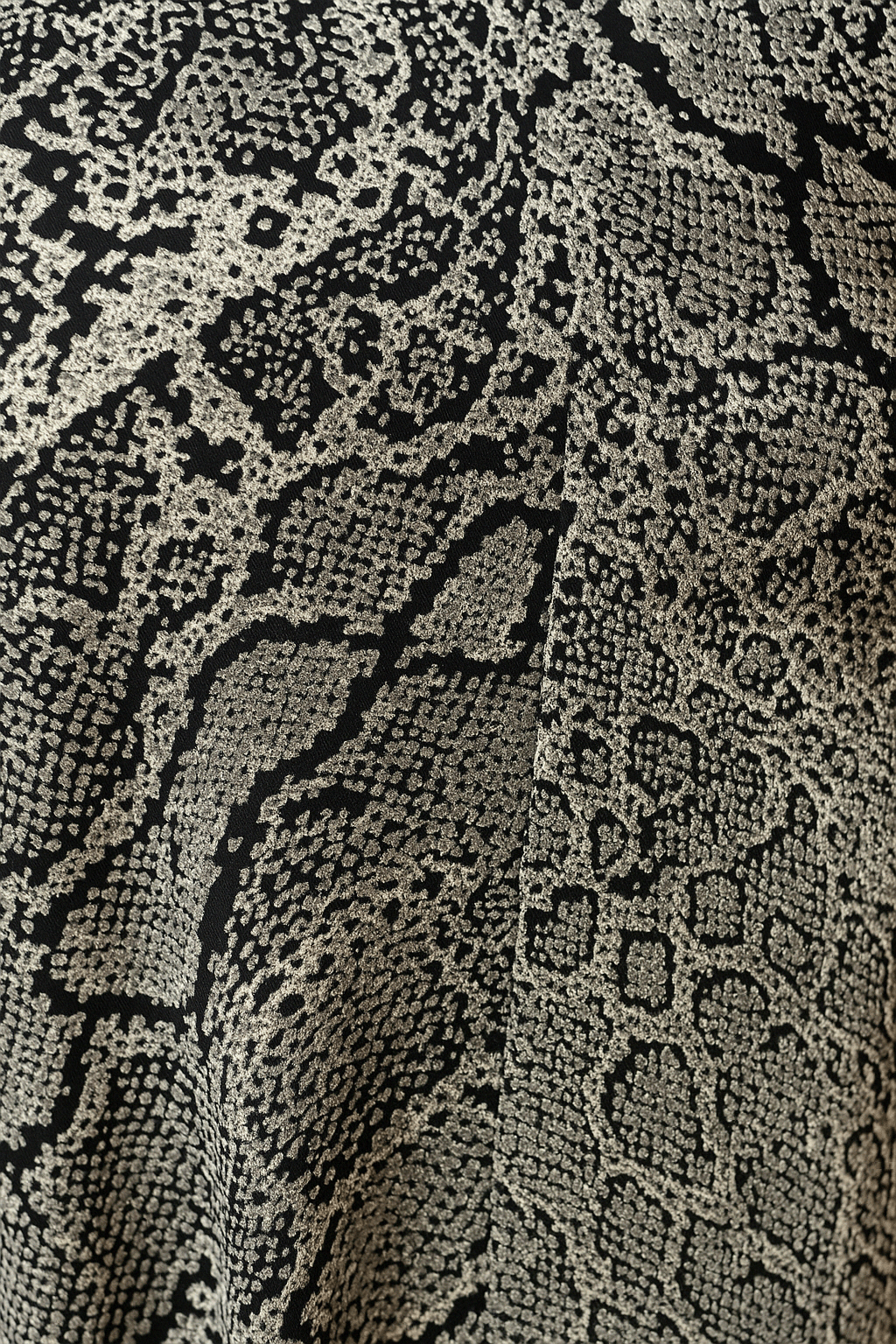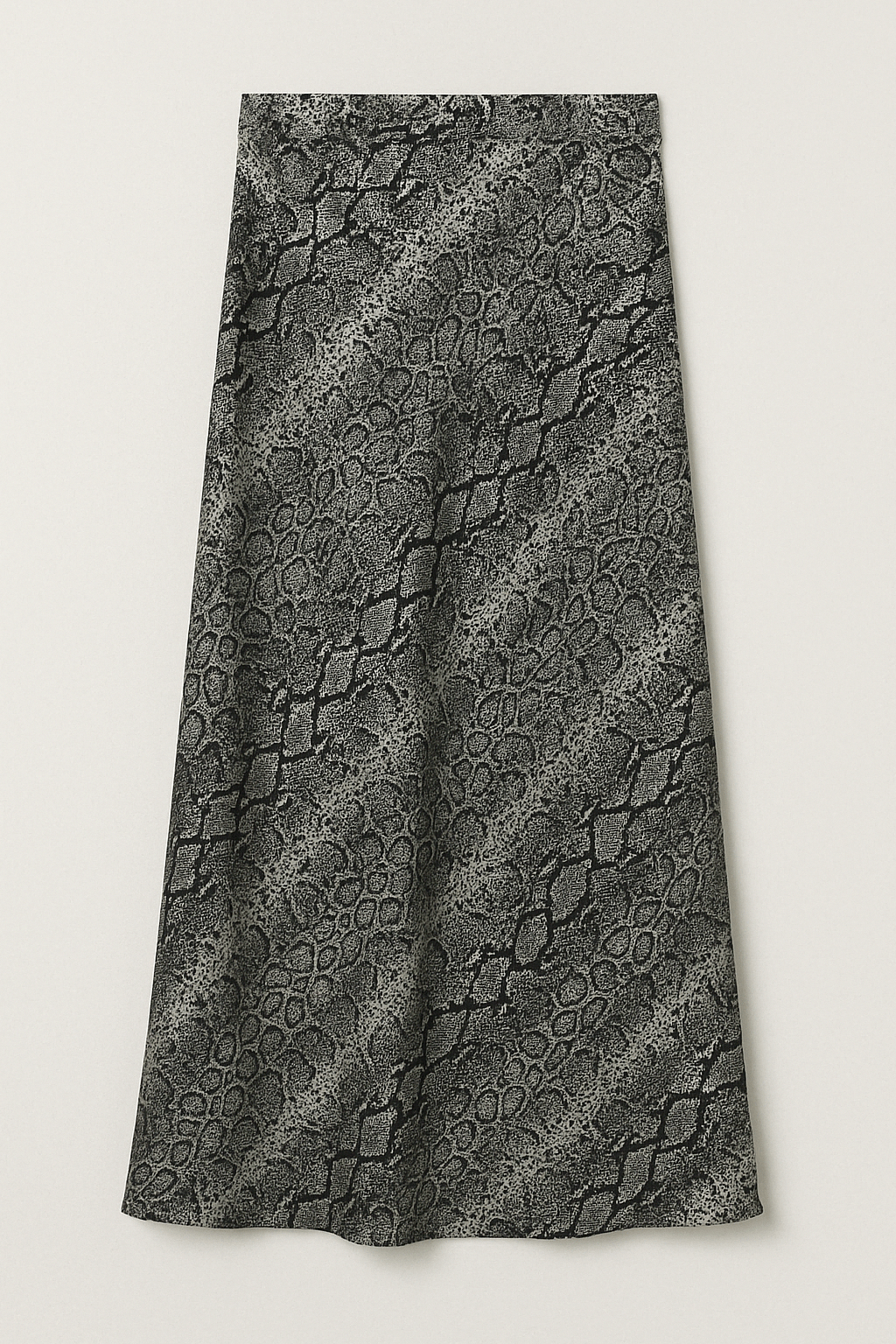 Suknja dužine do gležnja. Ravnog kroja. Elastični pojas. Print s uzorkom koji podsjeća na zmijsku kožu u nijansama crne i sive. Bez proreza. Izrađena od laganog i lepršavog materijala.