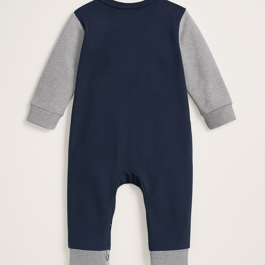 Pamučni kombinezon za bebe s dugim rukavima u sivoj boji i tamnoplavim trupom. Napravljen od organskog pamuka s natpisom "Daddy is my Super Hero" na prednjem dijelu. Praktično kopčanje na drukere između nogu olakšava presvlačenje.