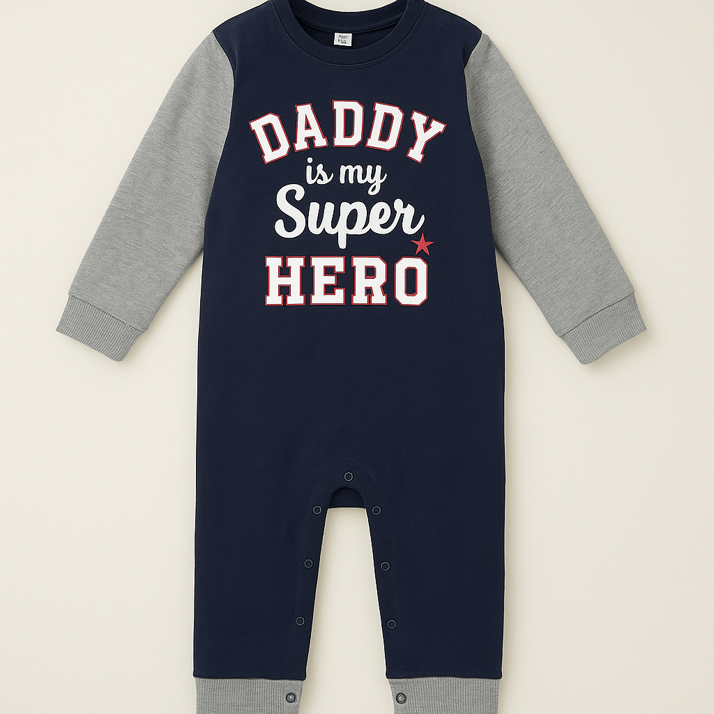 Tamnoplavi dječji kombinezon s natpisom "Daddy is my Super Hero"