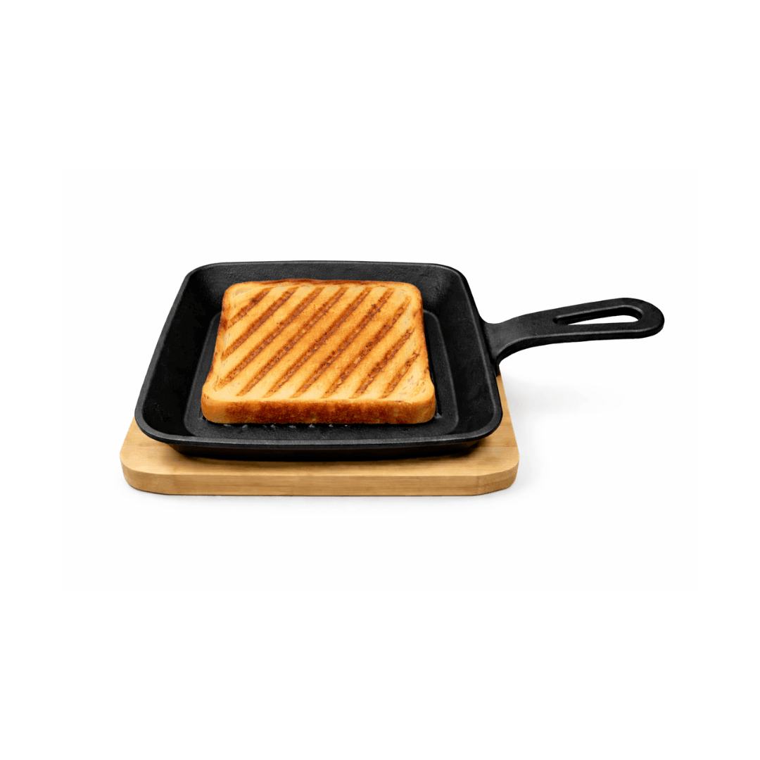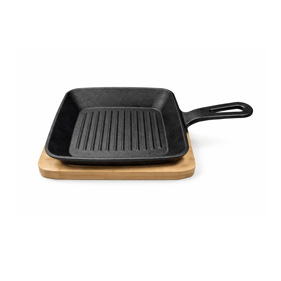 Mala tava od lijevanog željeza s rebrastom površinom i ručkom. Set uključuje drvenu dasku za posluživanje.