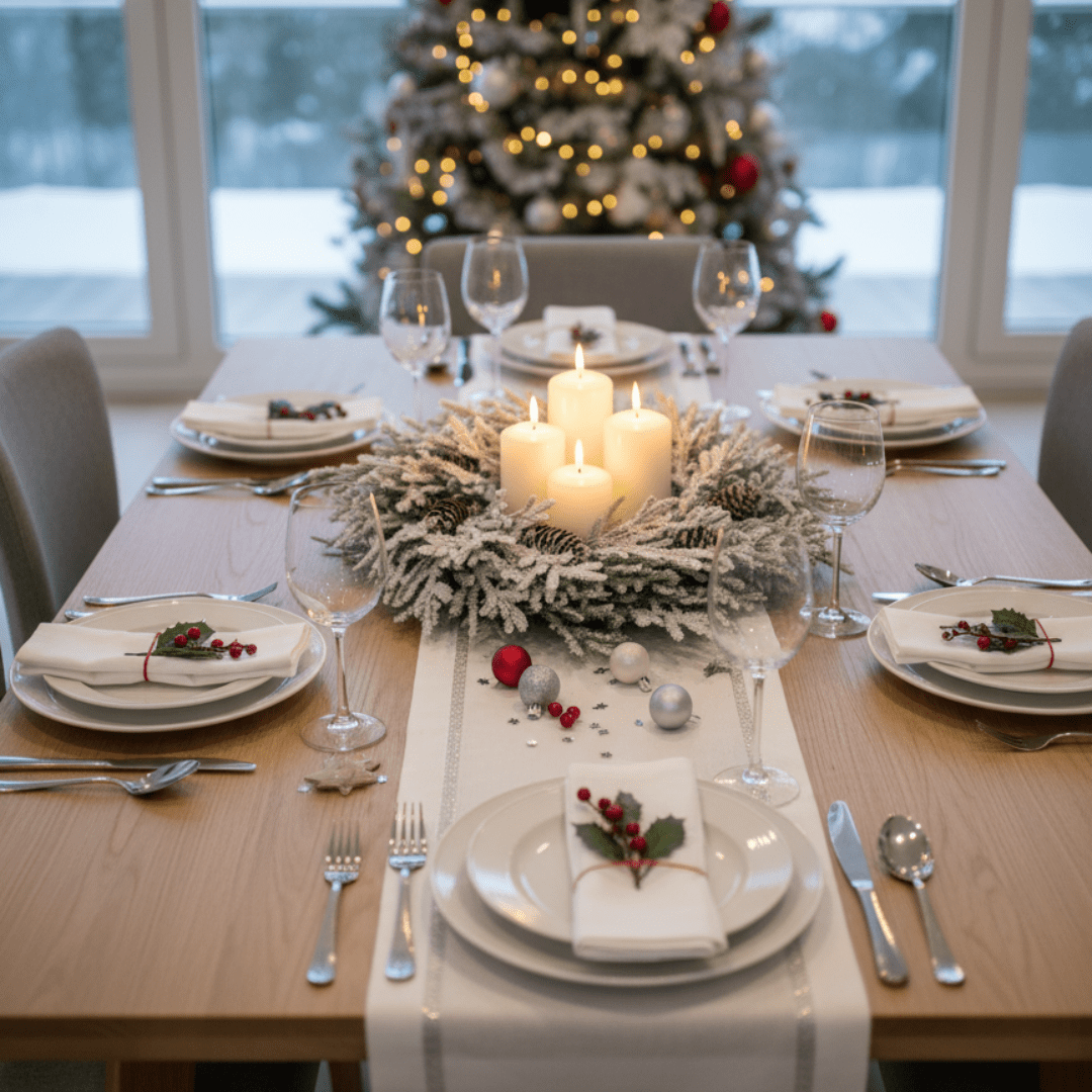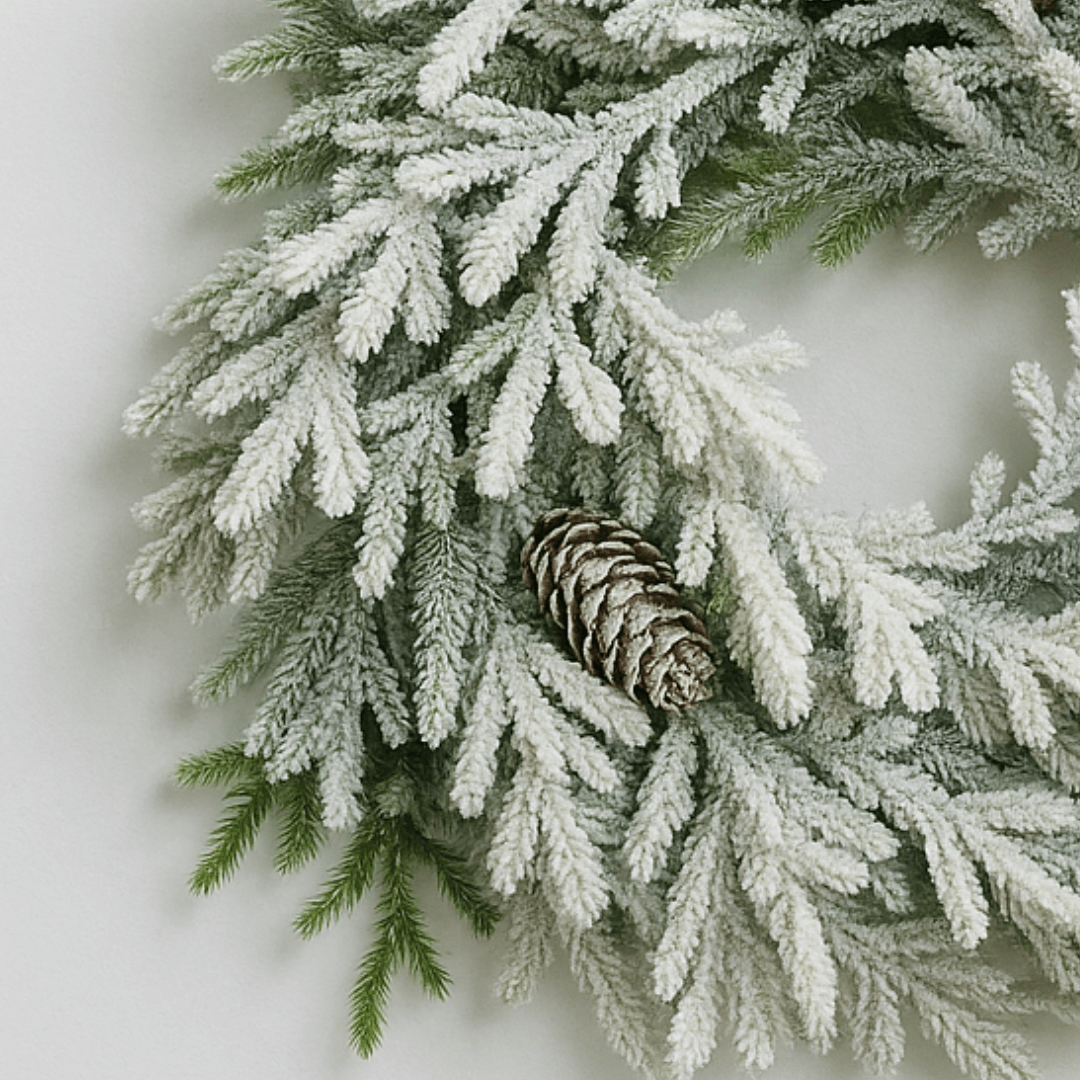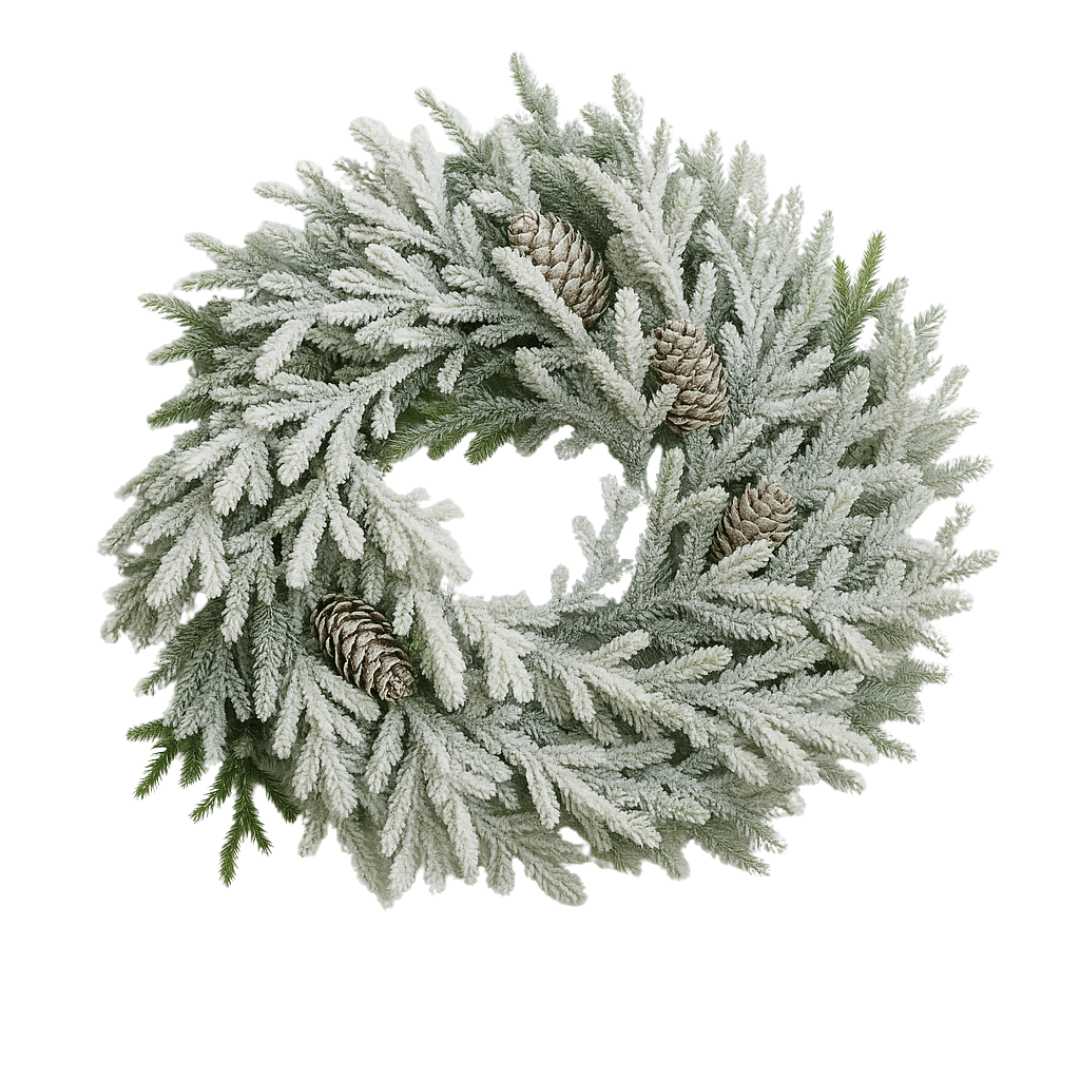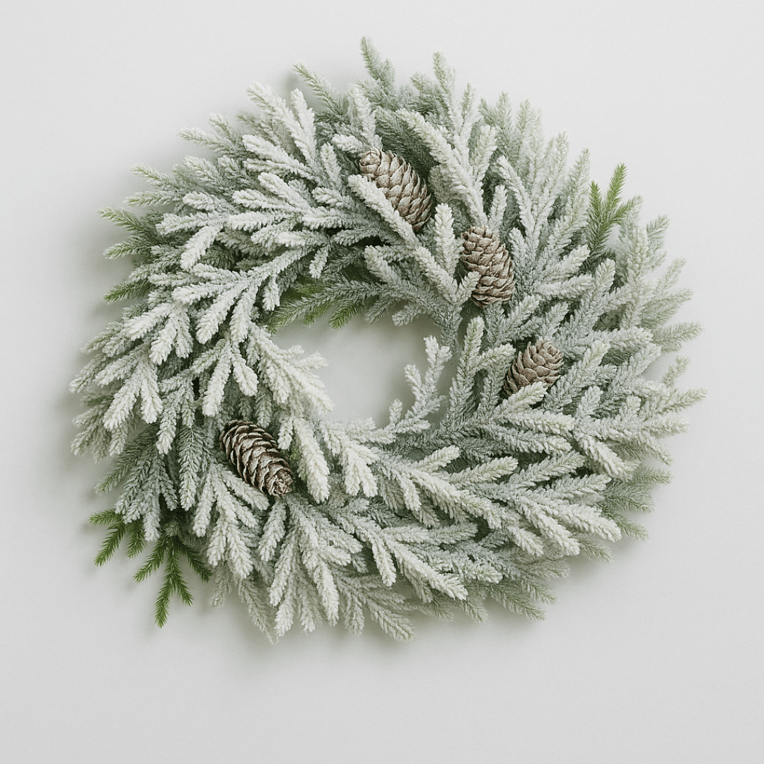 Manji vijenac s efektom snijega i prirodnim izgledom borovih grančica. Ukrašen realističnim šišarikama i nježnim “frosted” završetkom, donosi zimsku čaroliju u svaki dom.