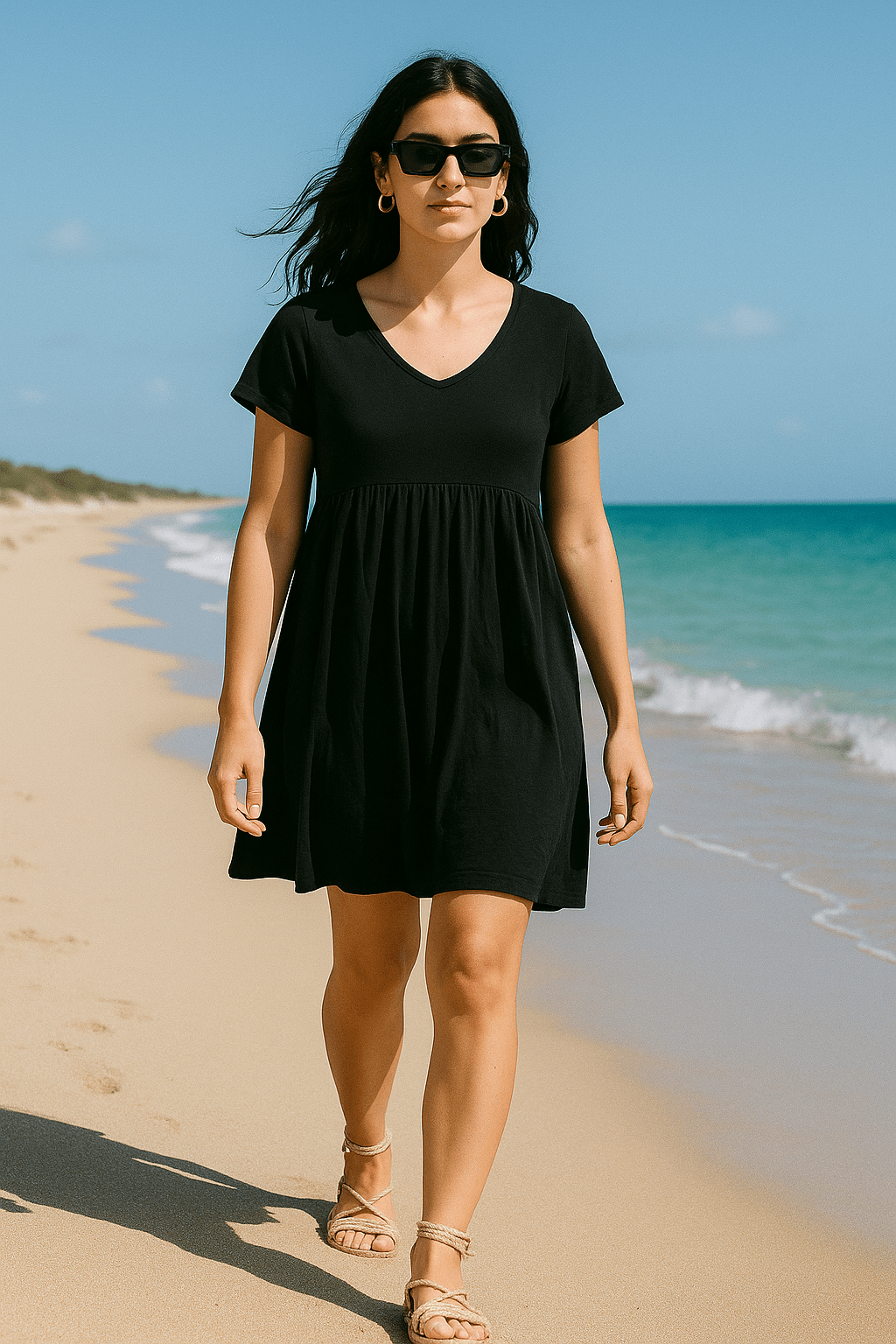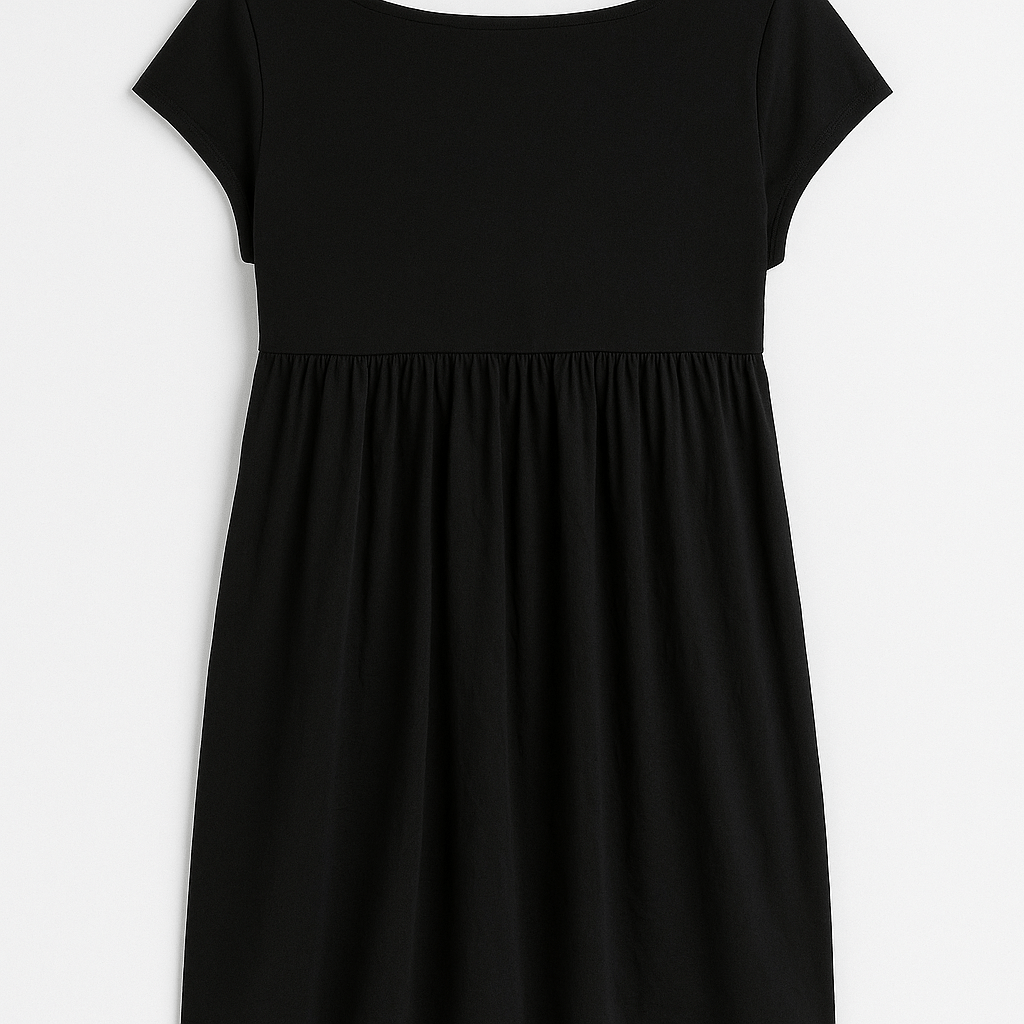 Haljina kratkih rukava s V-izrezom, nabrana ispod prsa. Dužina iznad koljena. Materijal 100% viskoza.