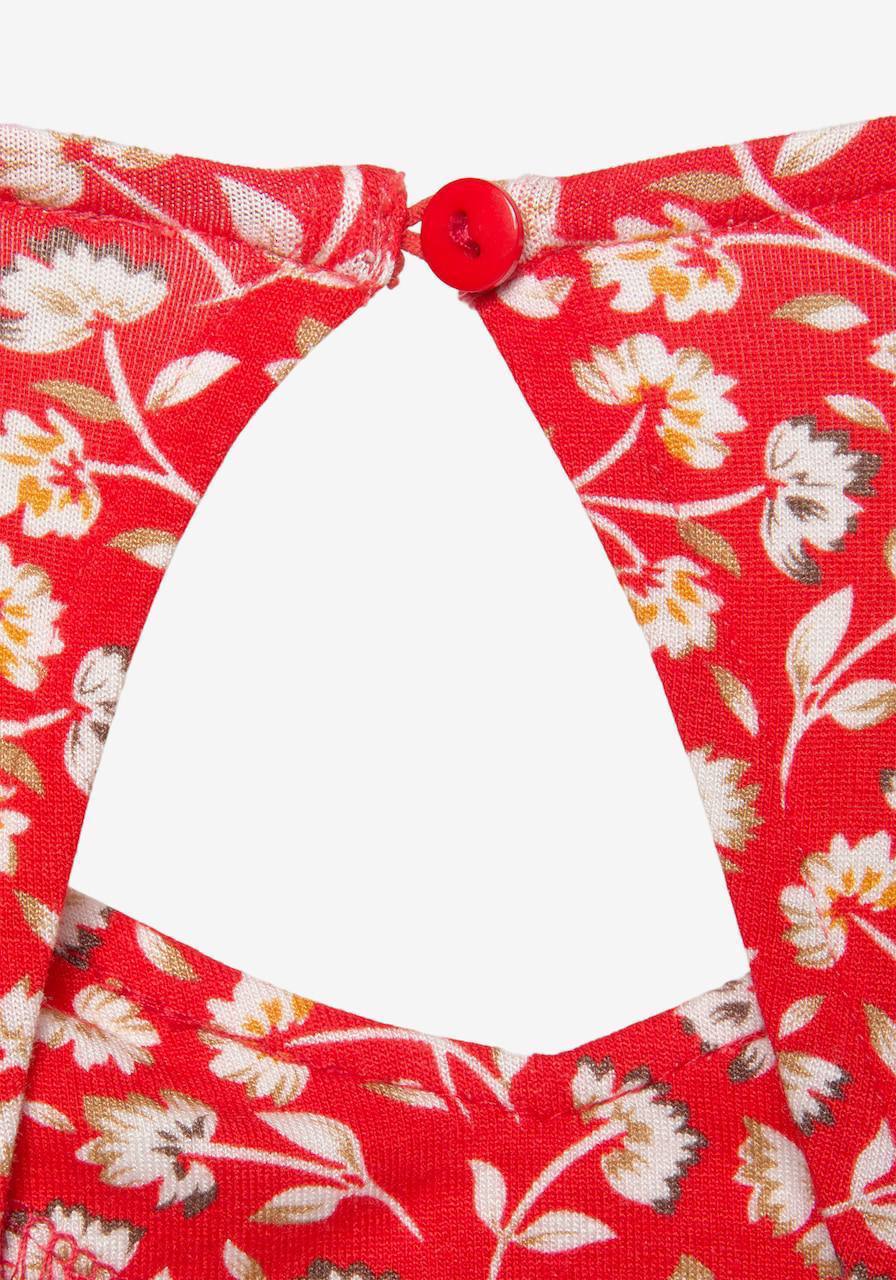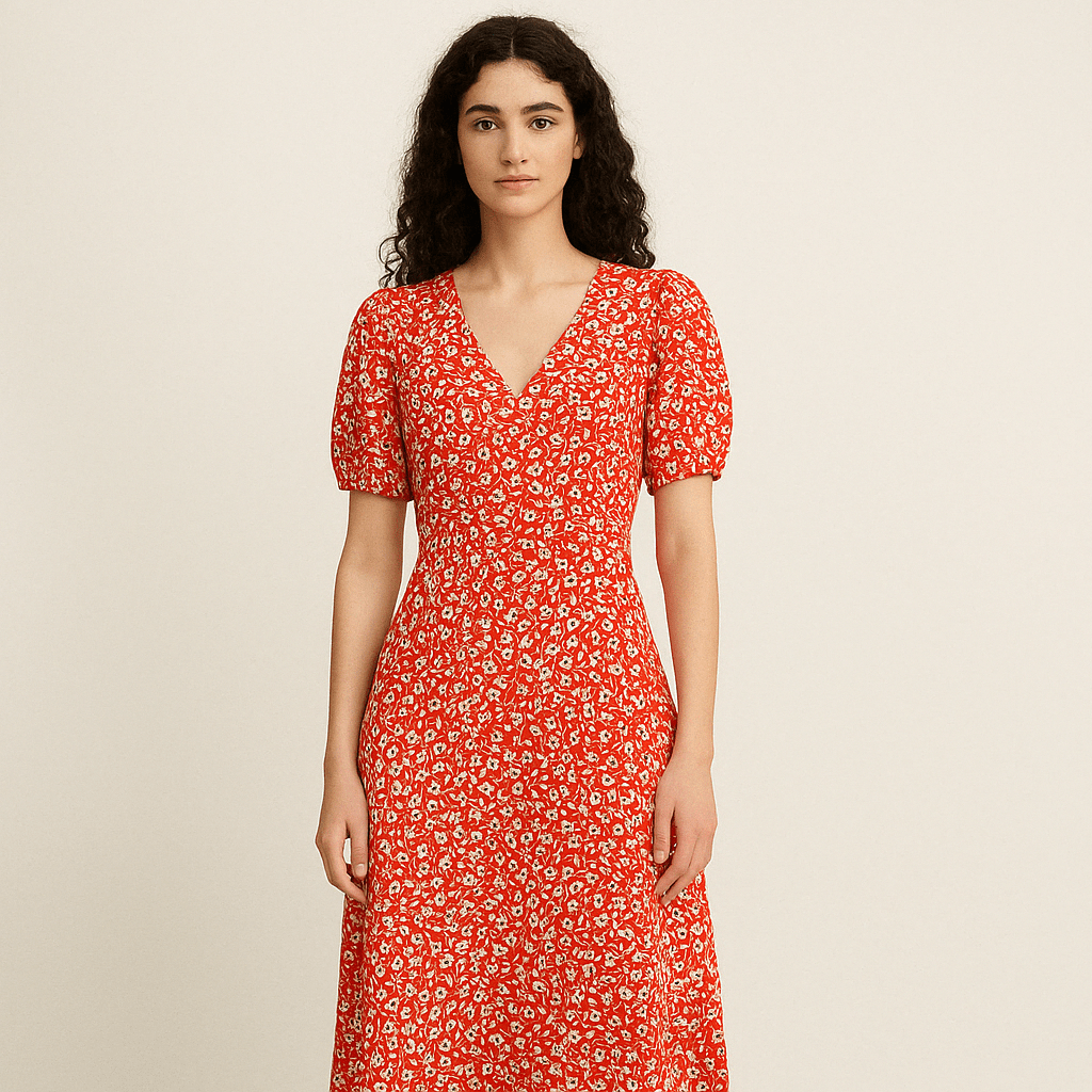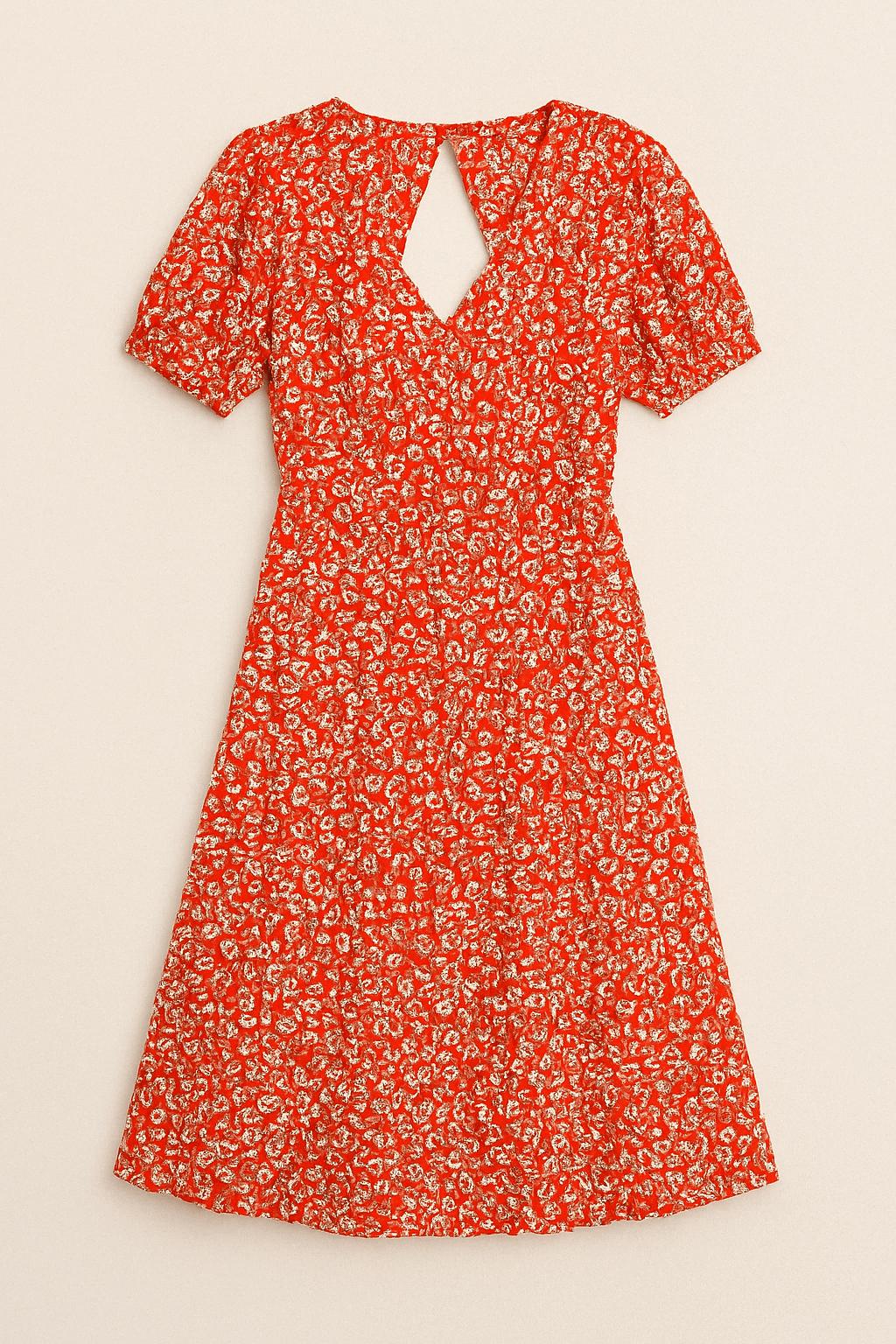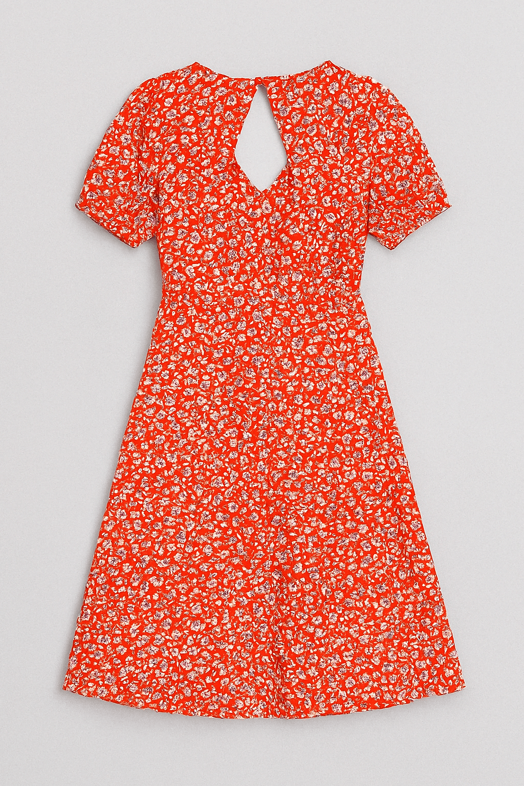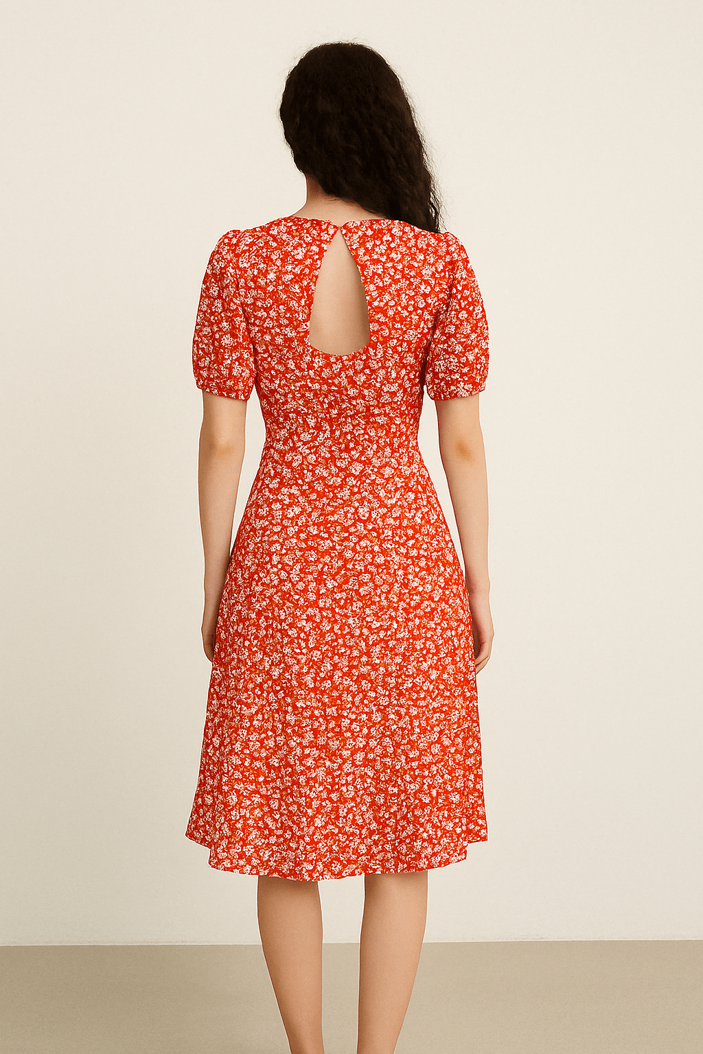 Ženstvena midi haljina u jarkoj boji s nježnim cvjetnim uzorkom. Lagani, prozračni materijal pruža udobnost tokom cijelog dana. Elegantni V-izrez i puf rukavi daju sofisticiran izgled. Izrez na leđima s diskretnim dugmetom za poseban detalj. A-kroj pristaje većini figura i naglašava struk. Dužina ispod koljena.
