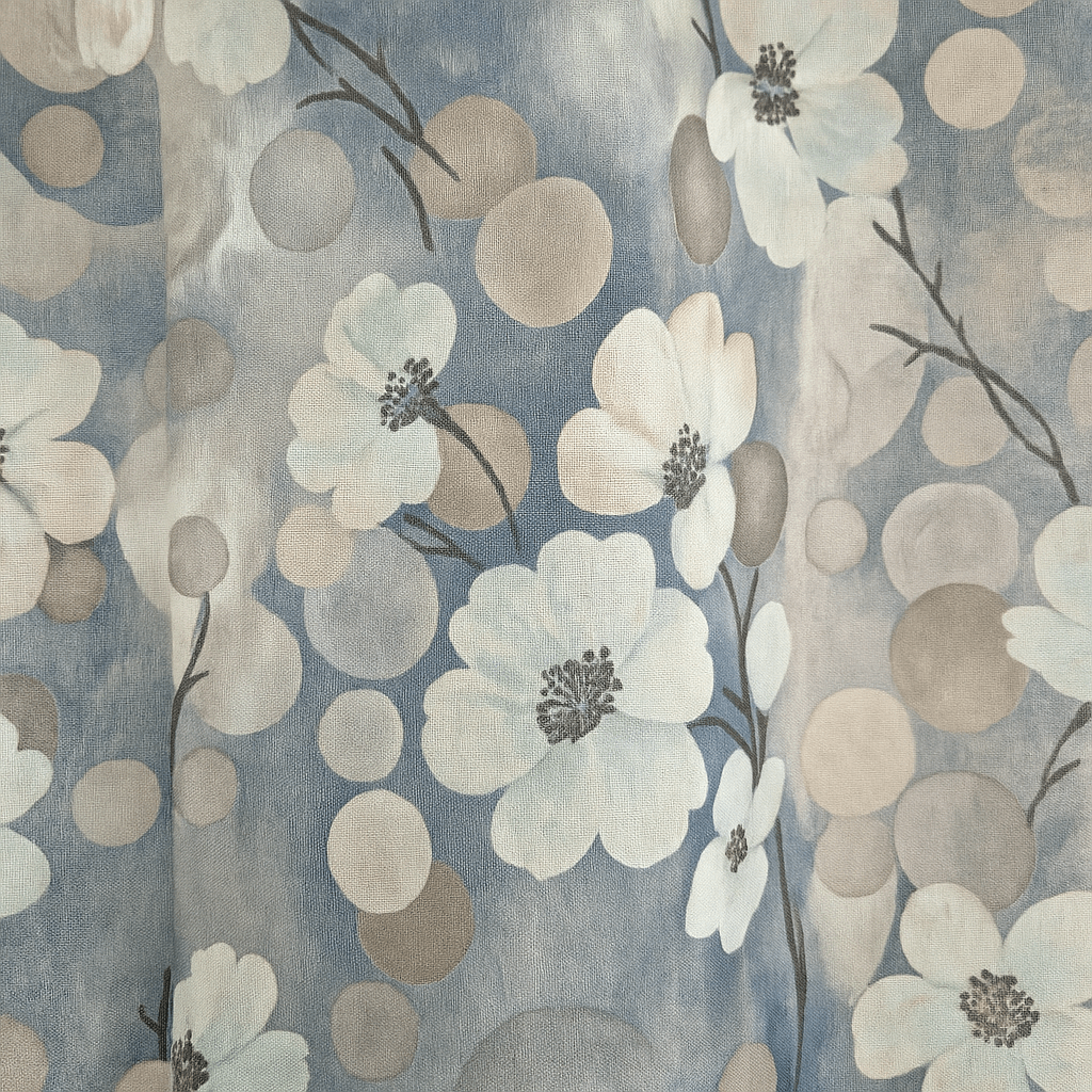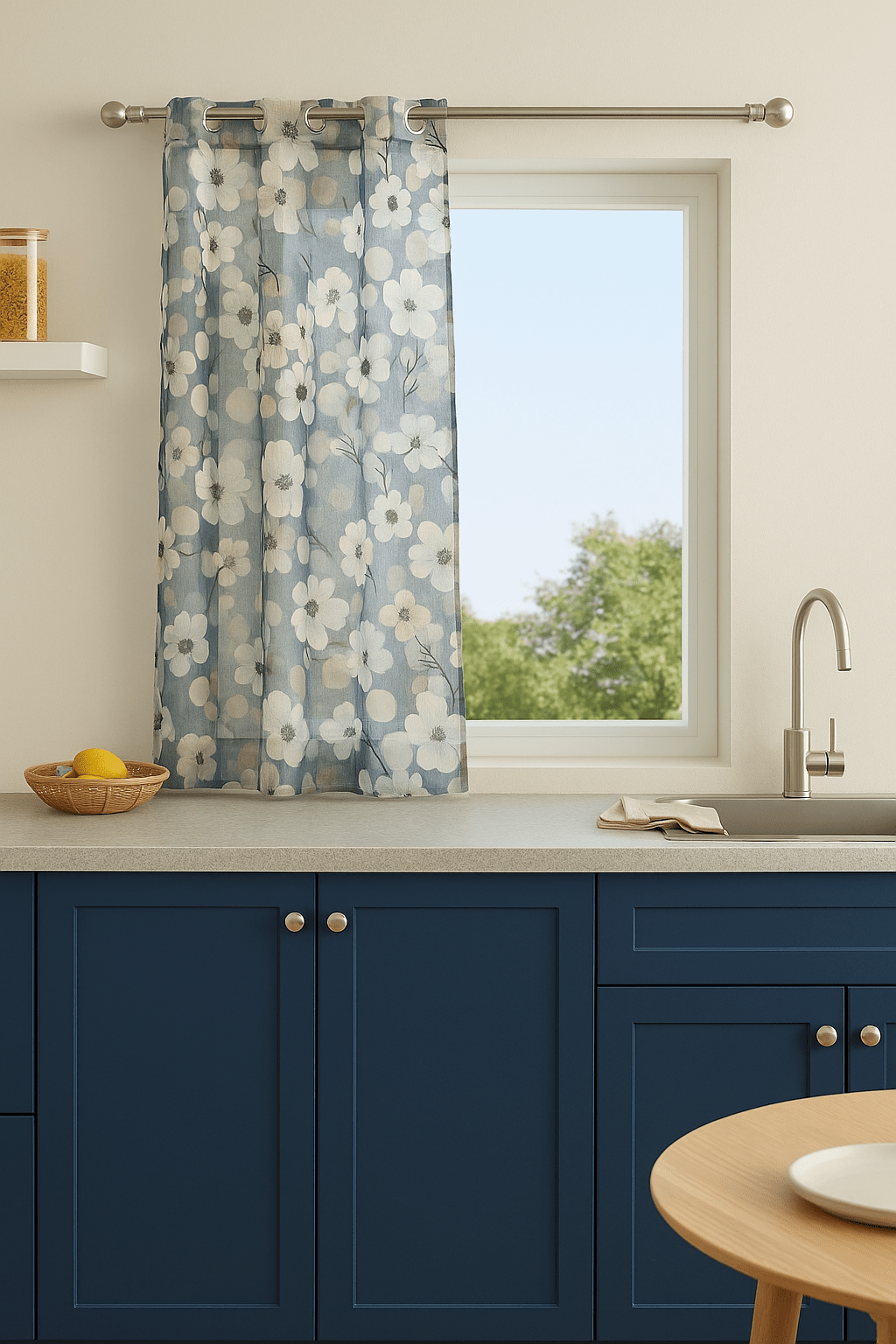 Poluprozirna zavjesa s tiskanim cvjetnim uzorkom. Ima metalne prstenove za jednostavno postavljanje.
