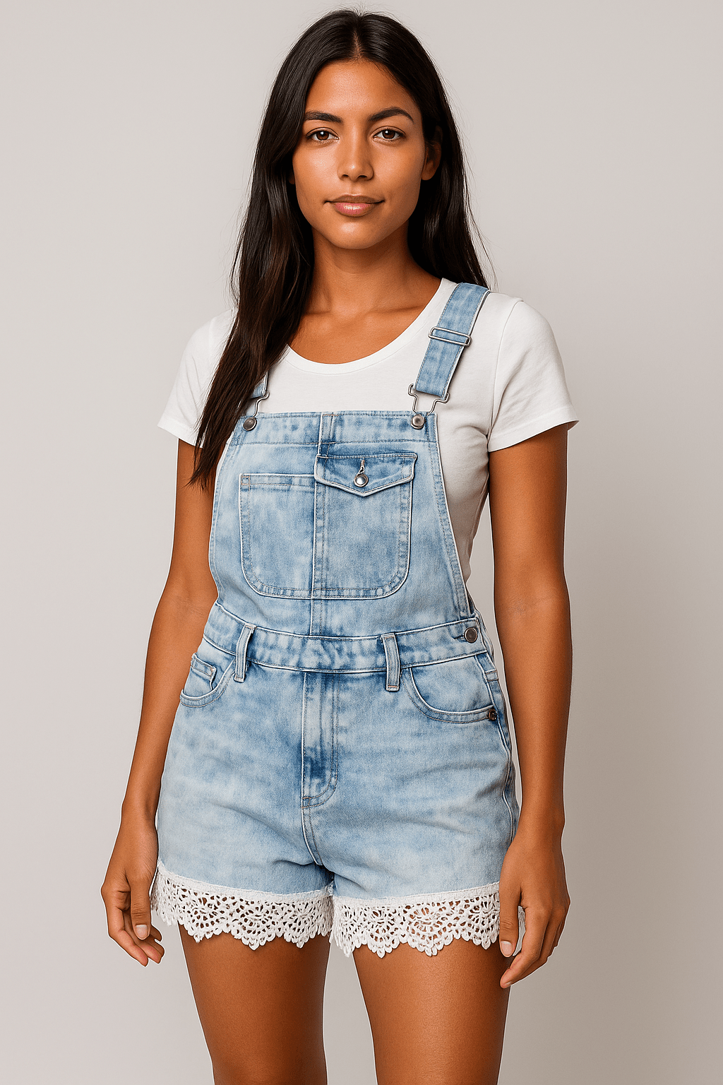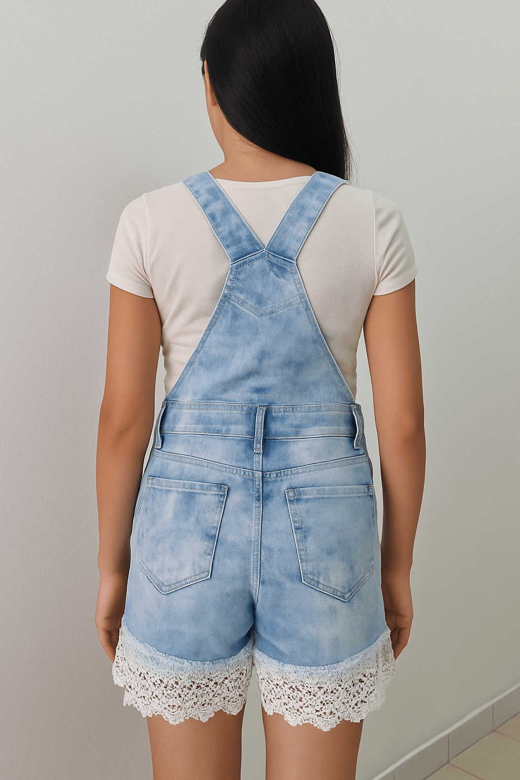 Kratke tregerice izrađene od trapera, s prednjim džepom na prsima i dva bočna džepa. Kopčanje na tregere s metalnim kopčama. Donji rub hlača ukrašen čipkastim detaljima. Model ima i dva stražnja džepa.